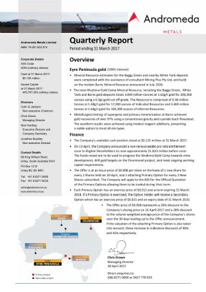 Andromeda Metals Ltd (ASX:ADN) is pleased to advise that it has been successful in its application for participation in the Federal Government's Exploration and Development Incentive Scheme for the 2015-16 financial year.