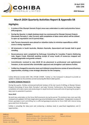 Altair Minerals Limited (ASX:ALR) (OTCMKTS:CHKMF) is listed on the Australian Securities Exchange (ASX) with the primary focus of investing in the resource sector through direct tenement acquisition, joint ventures, farm in arrangements and new project generation. The Company has projects located in South Australia, Western Australia and Queensland with a key focus on its Olympic Domain tenements located in South Australia.