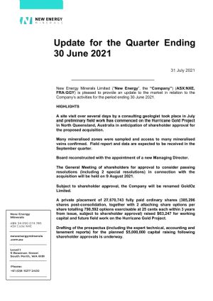 New Energy Minerals Limited (ASX:NXE) (FRA:GGY) (OTCMKTS:MTTGF) is pleased to provide an update to the market in relation to the Company's activities for the period ending 30 June 2021.