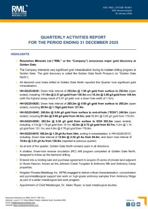 Resolution Minerals Ltd Listed on the ASX in 2017 and has a broad portfolio of assets, such as the Drake East Antimony-Gold Project in north-eastern NSW and George Project prospective for silica sand and uranium.
