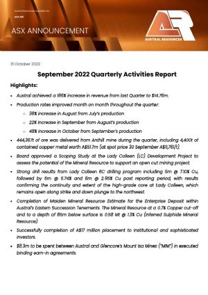 Austral Resources Australia Ltd (ASX:AR1) is a copper cathode producer operating in the Mt Isa region, Queensland, Australia. Its Mt Kelly copper oxide heap leach and solvent extraction/electrowinning (SXEW) plant has a nameplate capacity of 30,000tpa of copper cathode. Austral is developing its Anthill oxide copper mine which has an Ore Reserve of 5.06Mt at 0.94% Cu. The Company expects to produce 40,000t of copper cathode over a four-year period from mid-2022.