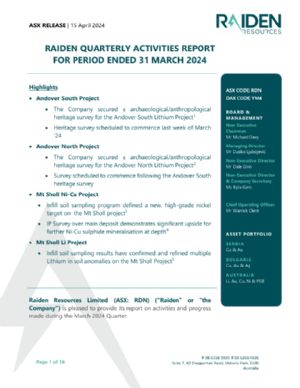 Raiden Resources Limited (ASX:RDN) (DAX:YM4) is a dual listed exploration and development company which is advancing the Mt Sholl Nickel-Copper-Cobalt-Palladium deposit in the Pilbara. The Company's portfolio host metals and commodities considered critical for the energy and electrification revolution.