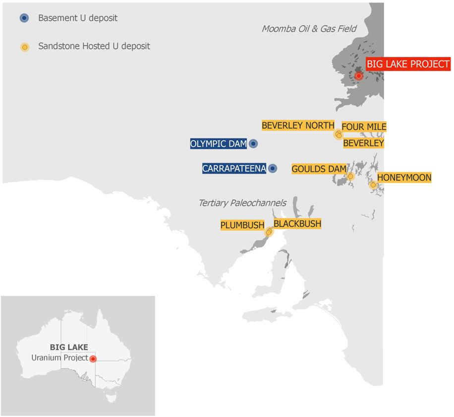 - Exploration at the Big Lake project is targeting the discovery of channel hosted roll front resources comparable to existing resources such as Honeymoon, Four Mile and Beverley within the State.