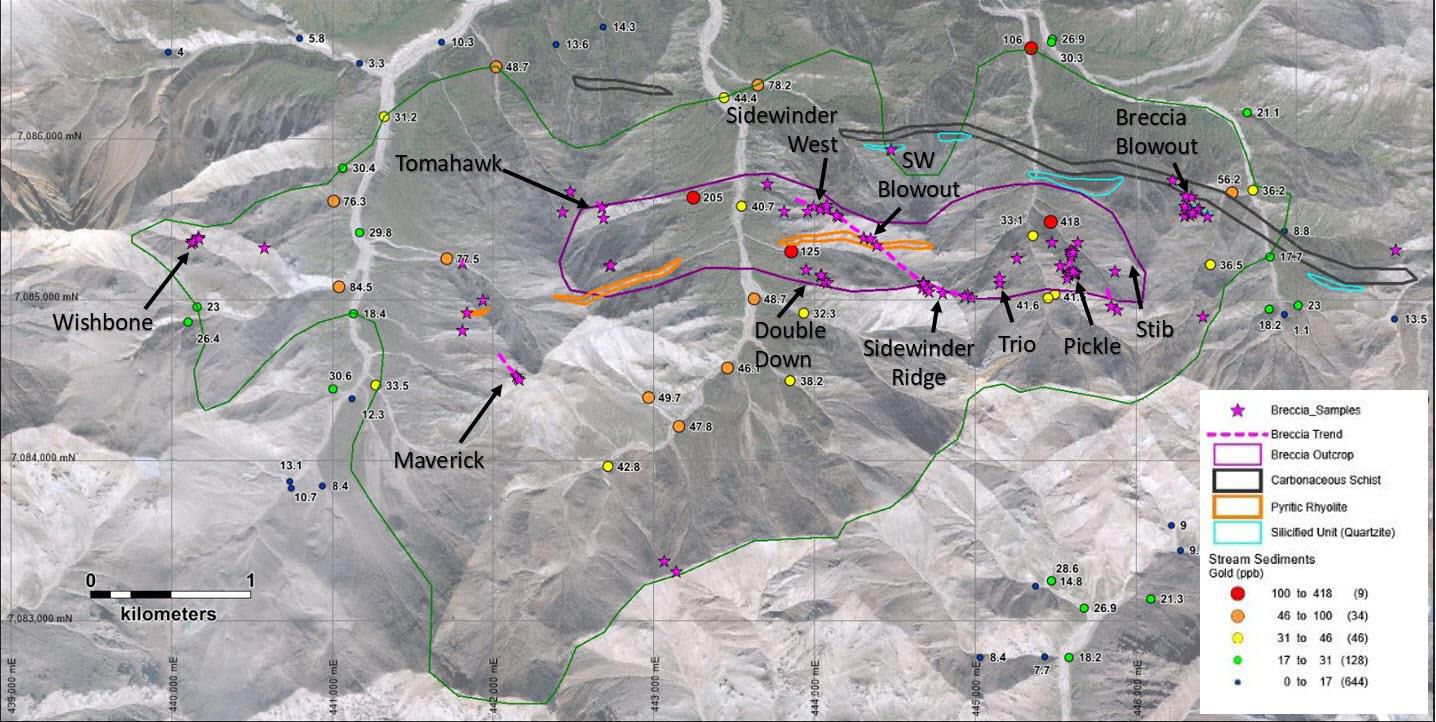 Geological reconnaissance and surface geochemical results to date suggest the Last Chance gold target lies within the upper brittle domain of a large orogenic and/or Intrusion Related Gold System ("IRGS"). Hydrothermal silica breccia bodies with their associated gold-arsenic-antimony anomalism may represent upper leakage of hydrothermal fluids immediately above a zone of more favourable gold deposition.