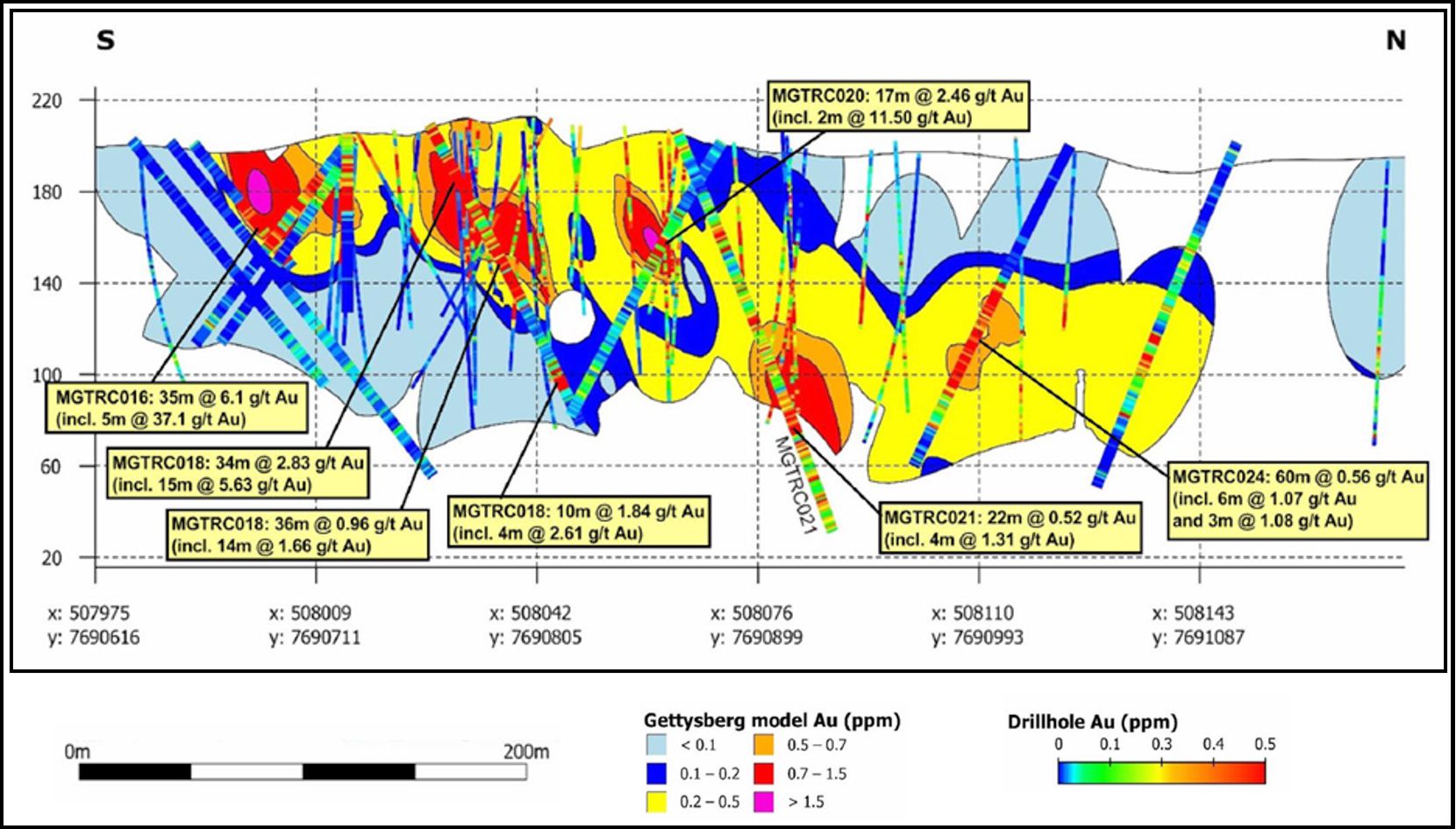 - Historic high-grade gold drill intercepts, such as 35m @ 6.1g/t and 15m @ 5.65g/t