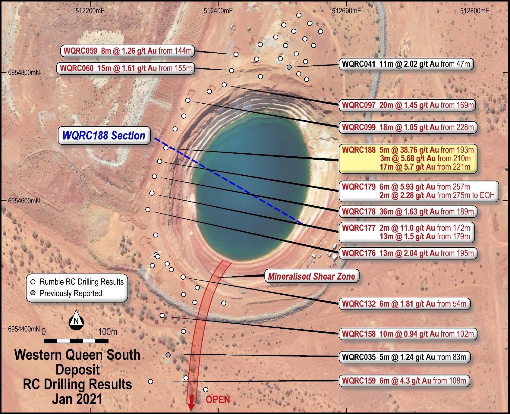 Drilling to the south of the Western Queen South Deposit and historic open pit (see image 2*) has highlighted continuity of gold mineralisation (Western Queen Shear Zone) beneath a palaeo-drainage system (up to 35m deep). Some 200m south of the Western Queen South open pit, hole WQRC159 returned: