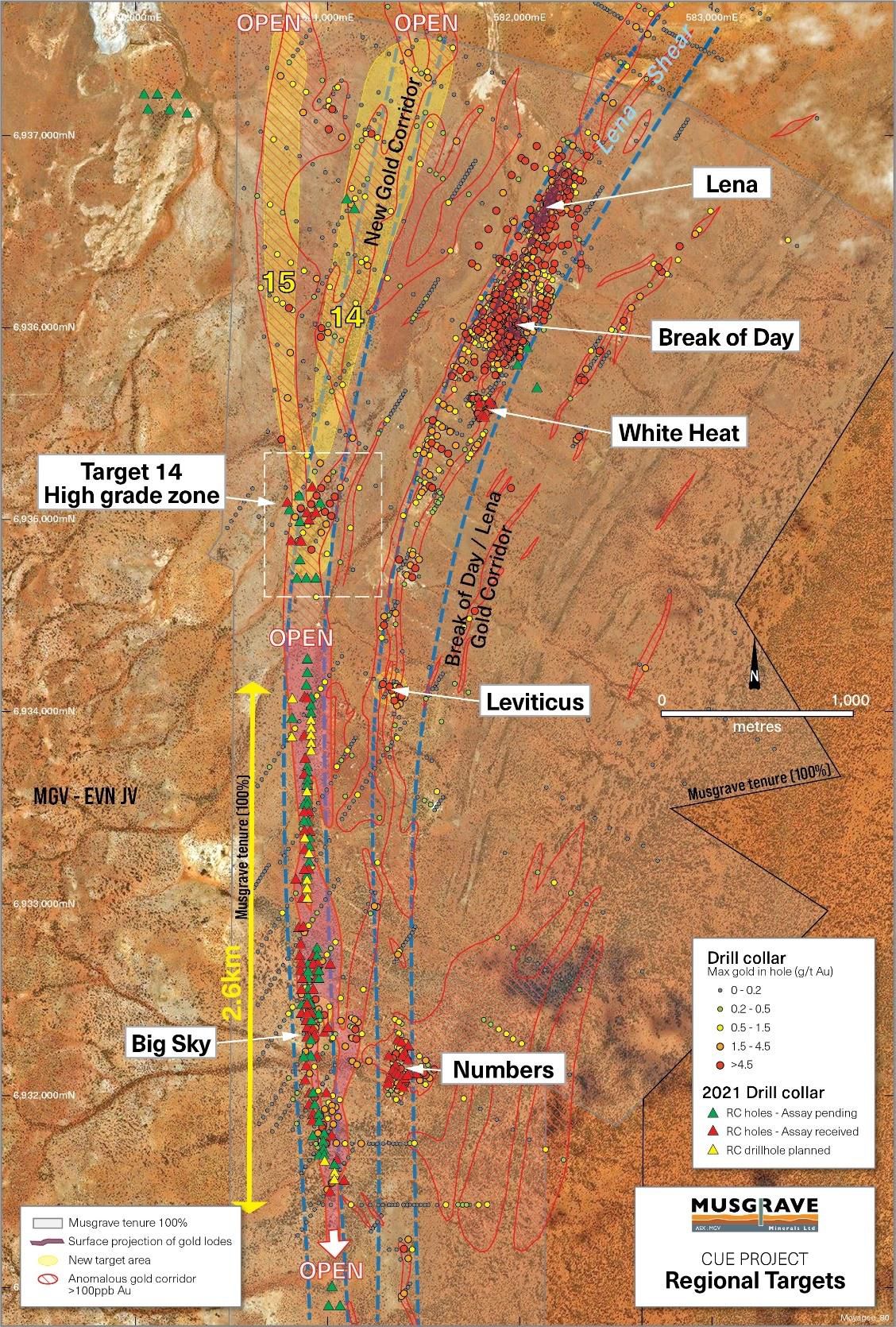 MGVMF:OTCMKTS) is pleased to report further strong assay results from reverse circulation ("RC") drilling at the Big Sky Prospect along the new gold corridor south-west of Lena and Break of Day on its 100% owned ground at its flagship Cue Gold Project in Western Australia's Murchison district (Figure 1). Assays for a further 35 RC drillholes have been received and continue to define thick regolith gold mineralisation within the extensive 2.6km-long aircore gold anomaly at Big Sky. Gold mineralisation remains open to the south and down dip at Big Sky where RC drilling is continuing.