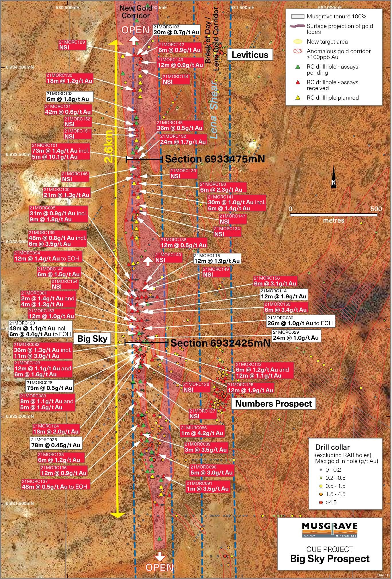 Musgrave Managing Director Rob Waugh said: "Big Sky is proving to be a significant large scale gold system and the RC drilling continues to return strong results of near surface gold mineralisation within the 2.6km long corridor. The continuity of the broad near-surface gold mineralisation intersected to date is very encouraging and demonstrates we are onto a large gold system at Big Sky with the potential to deliver a significant near surface resource. Unfortunately, assay turnaround has been slow but is starting to improve. We are still awaiting assays for more than 57 RC drill holes from Big Sky and we look forward to updating the market with further results as assays are received."