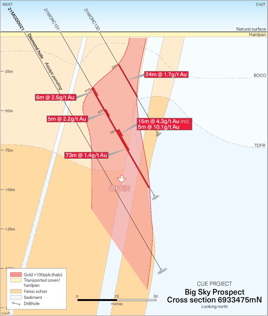 RC drill holes are spaced 40m apart along 40-100m spaced traverse lines with further drilling underway. The ongoing focus is on the higher grade and thicker intervals of gold mineralisation intersected to date. The extensive nature and continuity of the gold mineralisation supports the view that the Big Sky prospect has the potential to add to the Company's existing resource base at Cue. A multi-element assaying campaign is also underway to provide geochemical data. This will help guide the geological interpretation and fingerprint the gold and pathfinder element associations in this highly weathered corridor to aid further targeting.