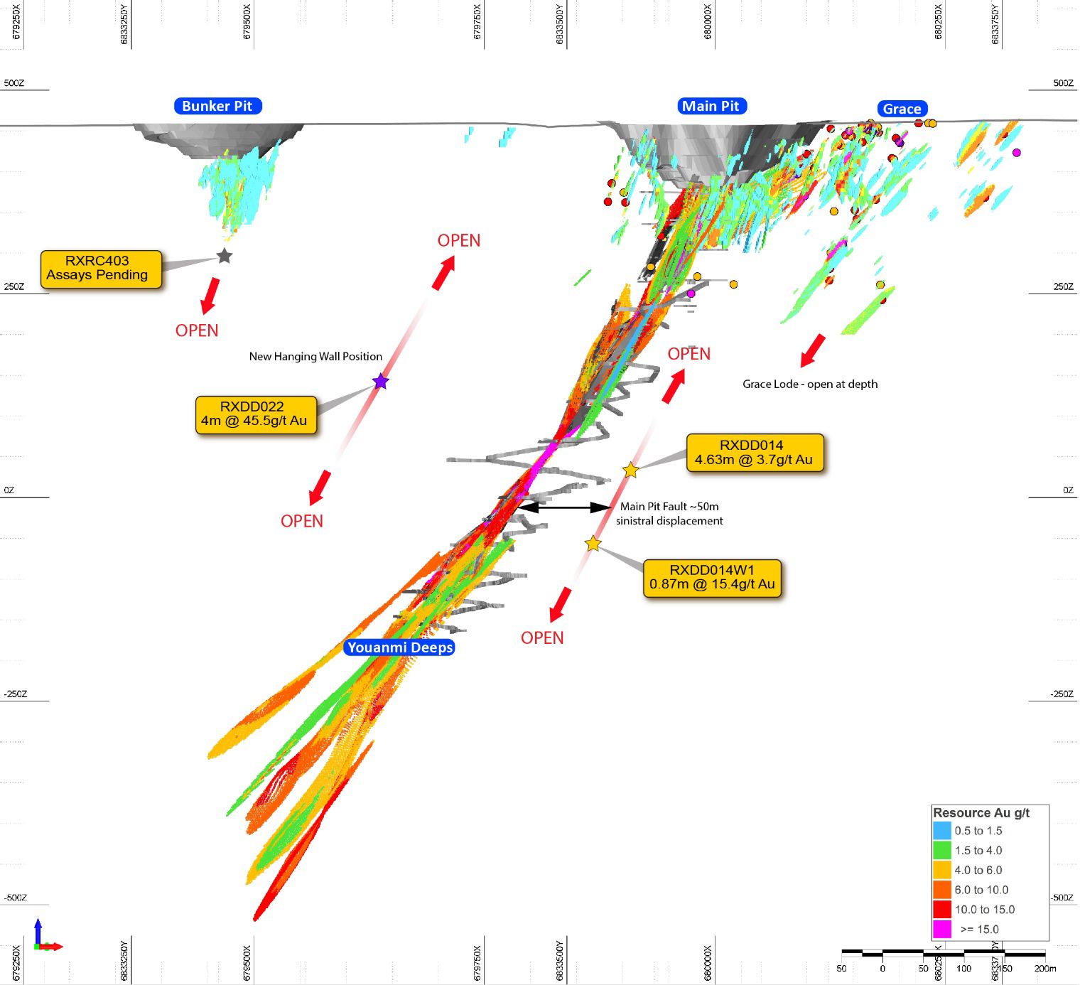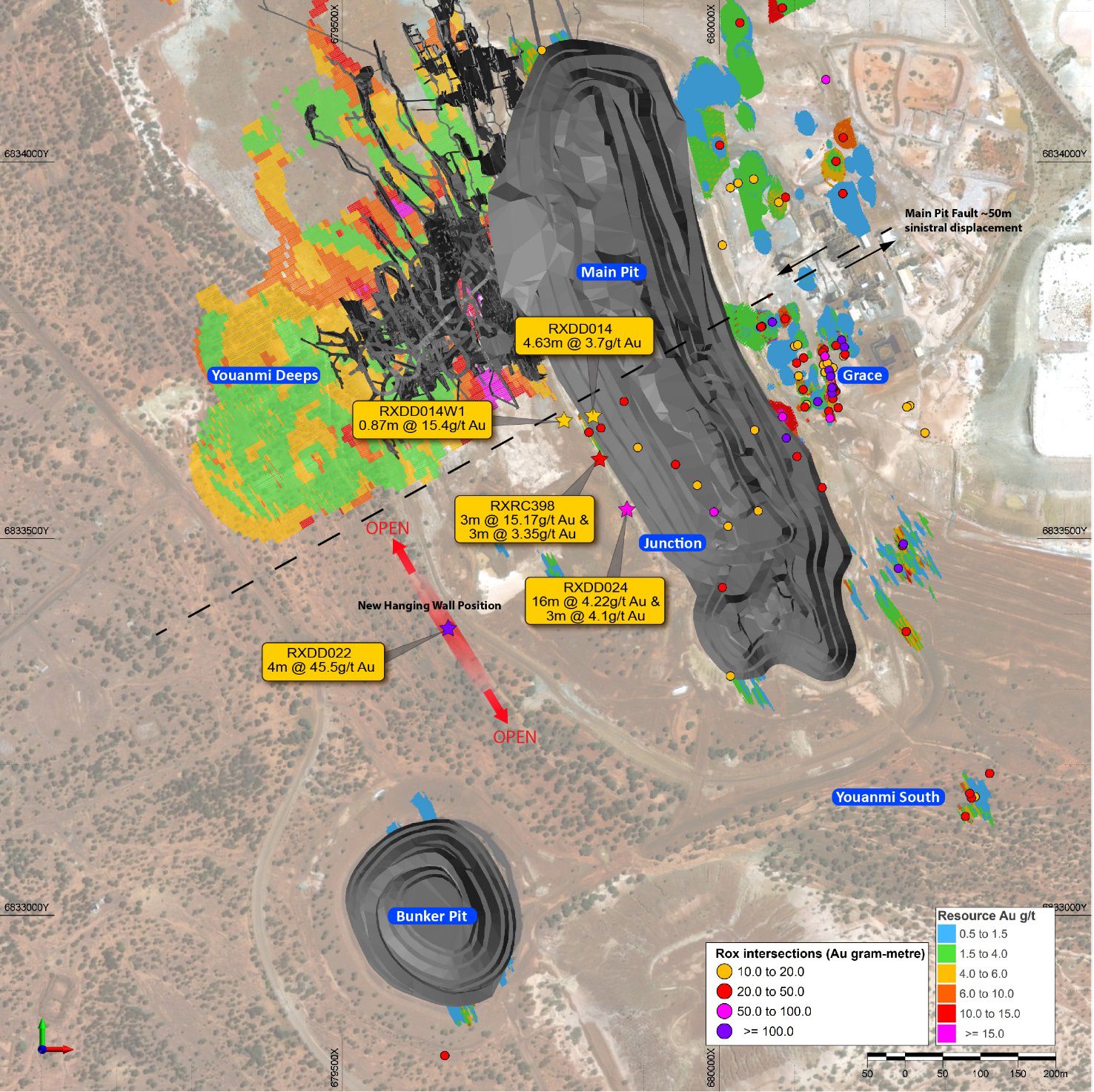 Drilling at Youanmi has intersected high-grade mineralisation in a newly defined position in the hanging wall to the main lode structure (Figures 1 and 2*). RXDD022 was targeting hanging wall mineralisation in an area between the Bunker Pit and the Youanmi Main lode. Encouragingly RXDD022 intersected 4m @ 45.5g/t Au from 341m which highlights the significant potential for further discovery in this area.