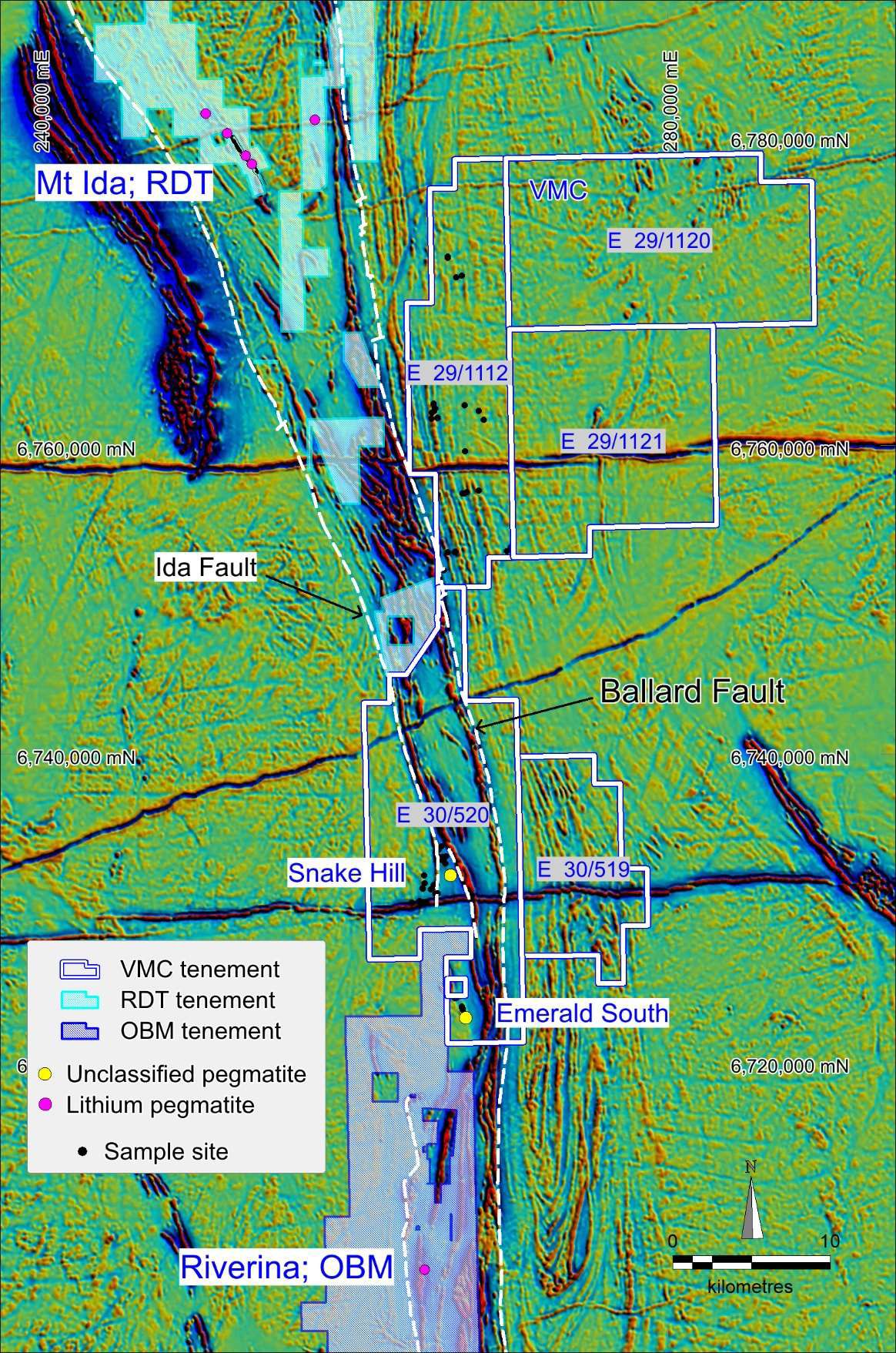 - VMC has initiated a review into the hard-rock lithium potential of the Henderson tenements. Available historical geological mapping confirms the common presence of pegmatite dykes cross-cutting the greenstone sequence at VMC's Snake Hill and Emerald South Prospects (Figure 1*; open file reports A14919, A21888).