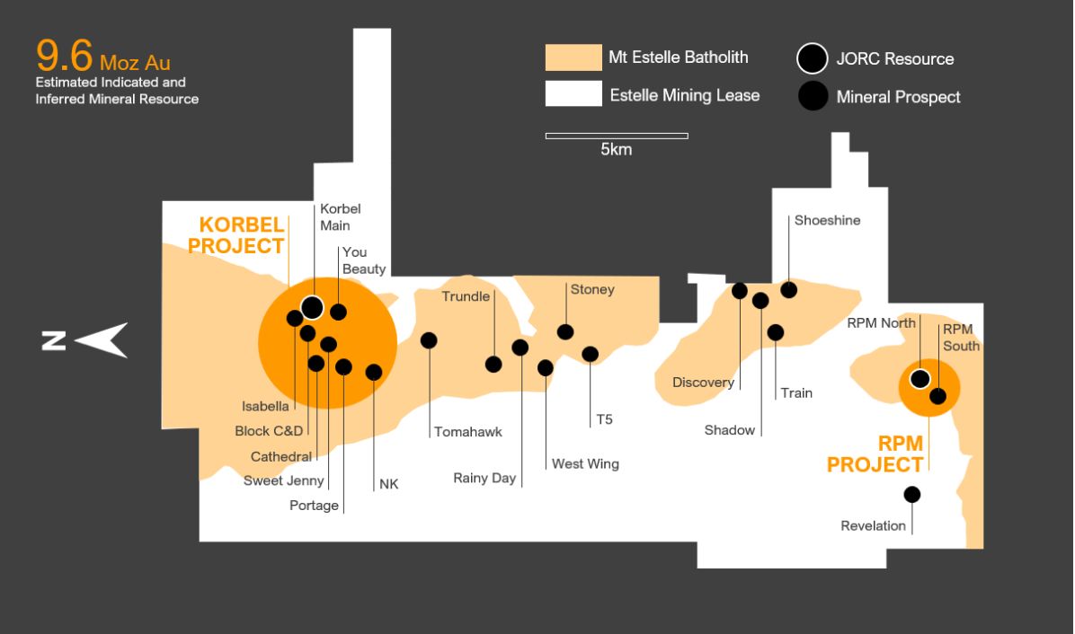 The scoping studies remain on track on the Korbel project, which lies at the northern end of the company's Estelle Gold Trend development, a 35km long corridor of 21 identified gold prospects bracketed by the RPM Project in the south (Figure 1). Currently, these two flagship projects have a combined total estimated JORC gold resource of 9.6 million ounces (Moz) (3.0 Moz Indicated and 6.6 Moz Inferred).