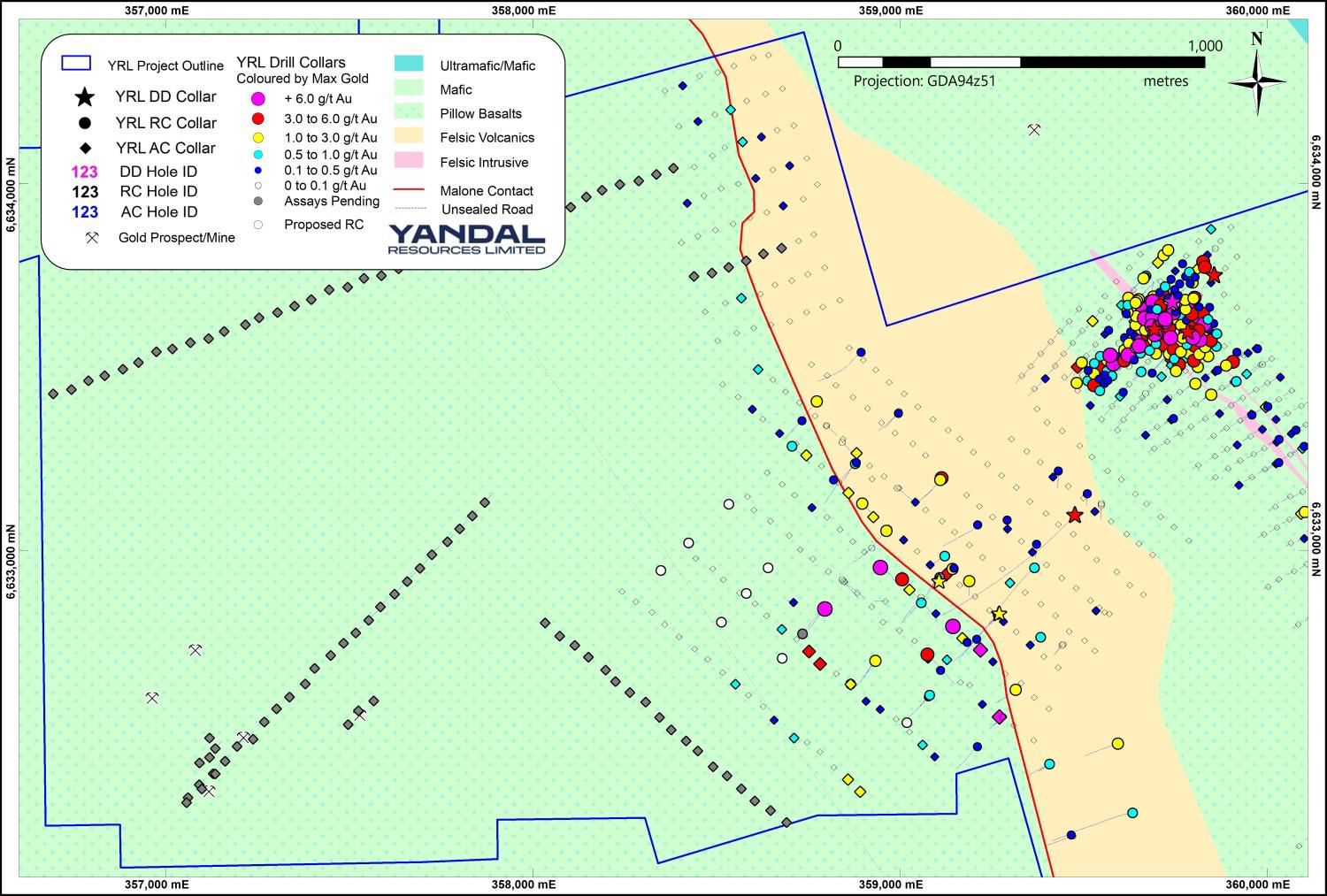 The majority of the holes were drilled to test the continuation of the east dipping Malone felsic-mafic contact to the south. Only low level results were returned as outlined in Table 1*.