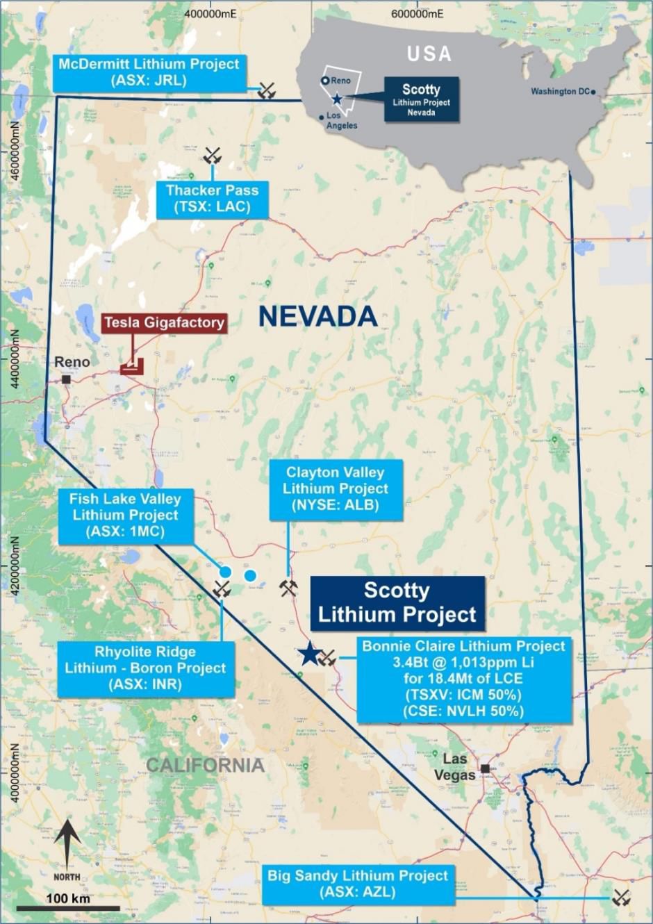 "The Scotty Lithium Project is located in Nevada immediately adjacent to one of North America's largest lithium resources. The Scotty Lithium Project is also located only 70km from the only lithium producing mine in the US, and just 300km from Tesla's Gigafactory.
