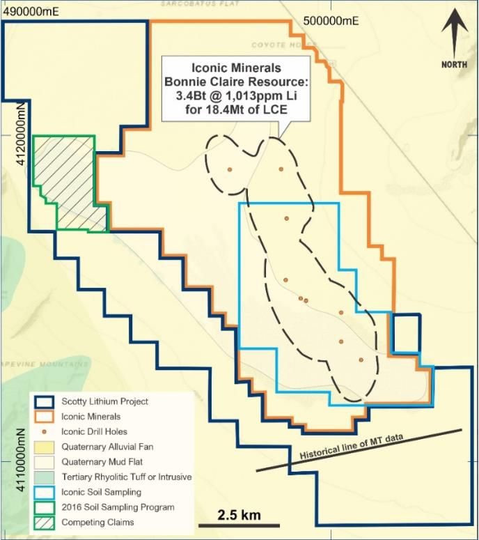 Large Scale Asset: The Scotty Lithium Project area comprises 700 placer mining claims, entirely on BLM land, covering approximately 14,000 acres that immediately adjoin and surround Iconic Minerals Limited's (Iconic) Bonnie Claire Lithium Project. Inferred Resources at Iconic's Bonnie Claire Lithium Project comprise 3.4Bt @ 1,013ppm Li for 18.3 Mt of Li2CO3 equivalent.