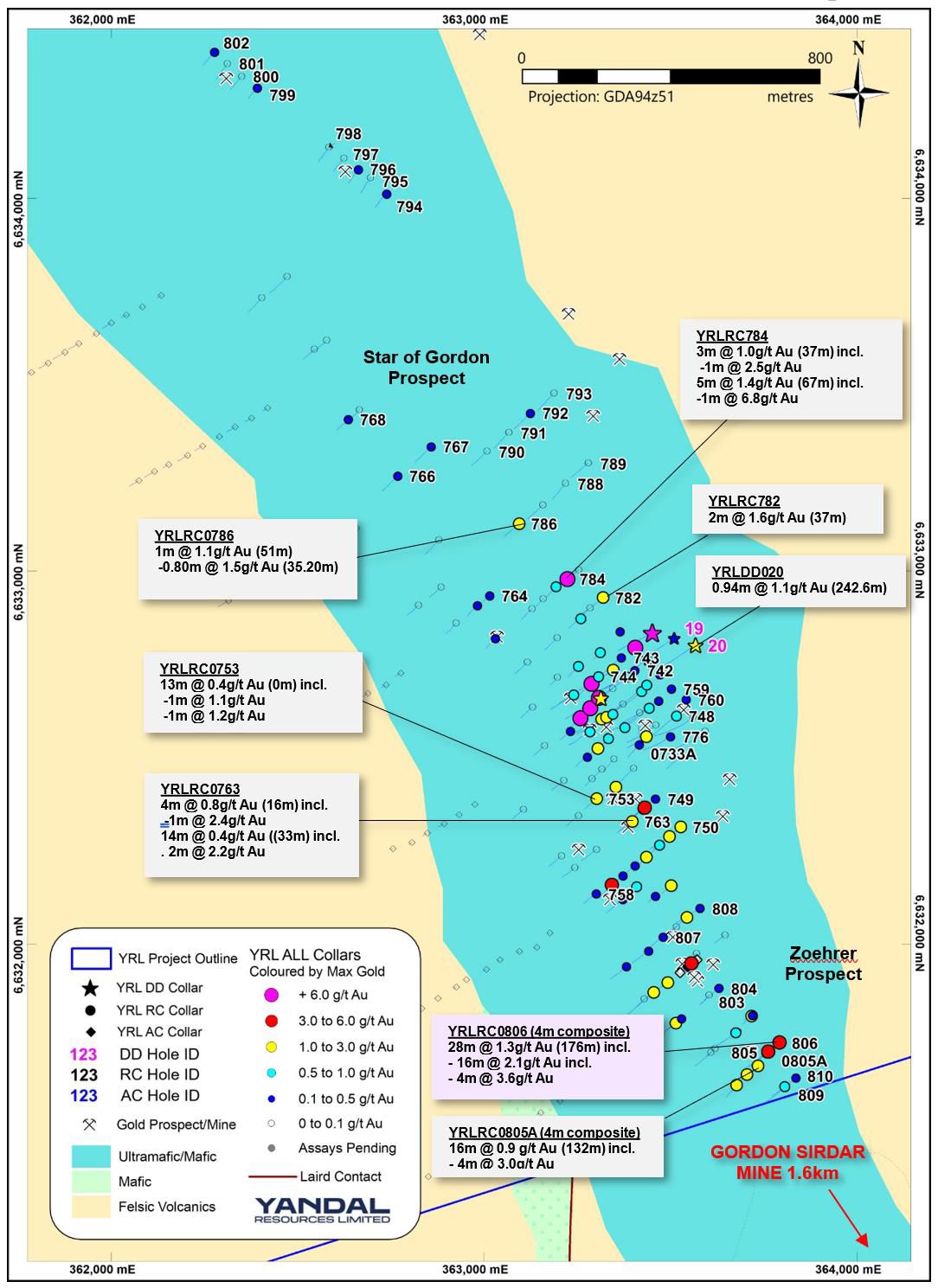 At the Star Gordon prospect assay results were received from 19 RC holes (2,553m) and 2 diamond holes (551.3m) testing for strike and down-dip extensions and repetitions of high-grade mineralisation previously reported for Star of Gordon including 10m @ 8.4g/t Au in YRLRC0630.
