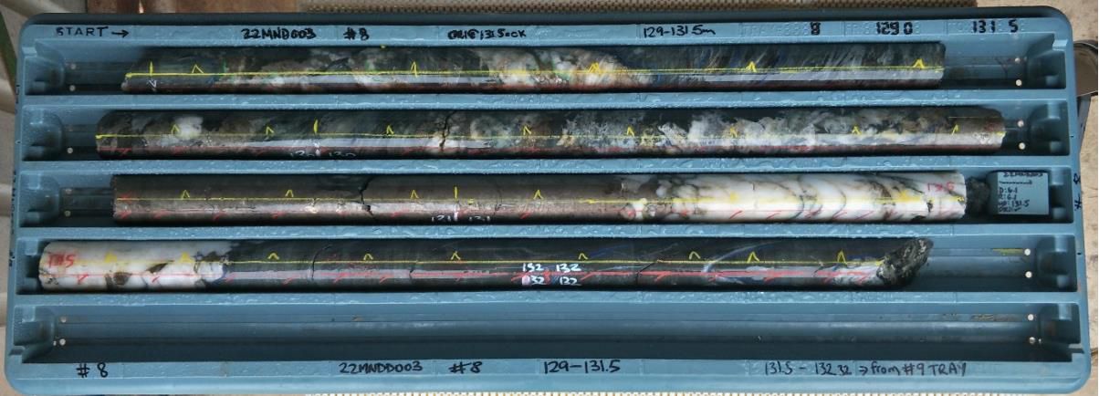 Drill hole 22MNDD003 NQ2 core size was drilled to 142.2m depth at -55deg inclination towards approximately 130deg magnetic as a diamond tail off of MMG RC drill hole 22MNRC020, into a previously untested area. Large quartz-carbonate vein breccias with massive pyrrhotite and chalcopyrite were discovered within dolerite host rock (photo 1*). The drill intercept at Providence is interpreted to be the down dip extension of 21MNRC007 that has opened up, due to the boudinage form of mineralisation. Because the veining up dip is within a highly deformed leucogabbro dyke on a sediment contact and this deeper intercept is on the same structure entirely within basal dolerite, the character of the gold mineralisation has changed.