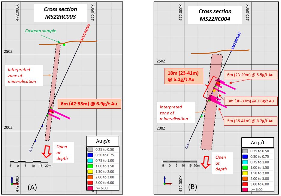 o 18m @ 5.1 g/t Au from 23m; (MS22RC004), including: