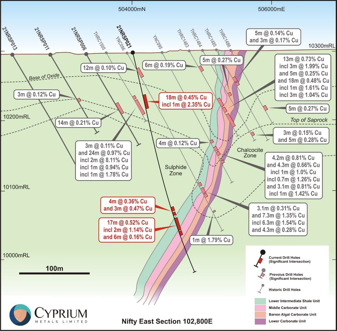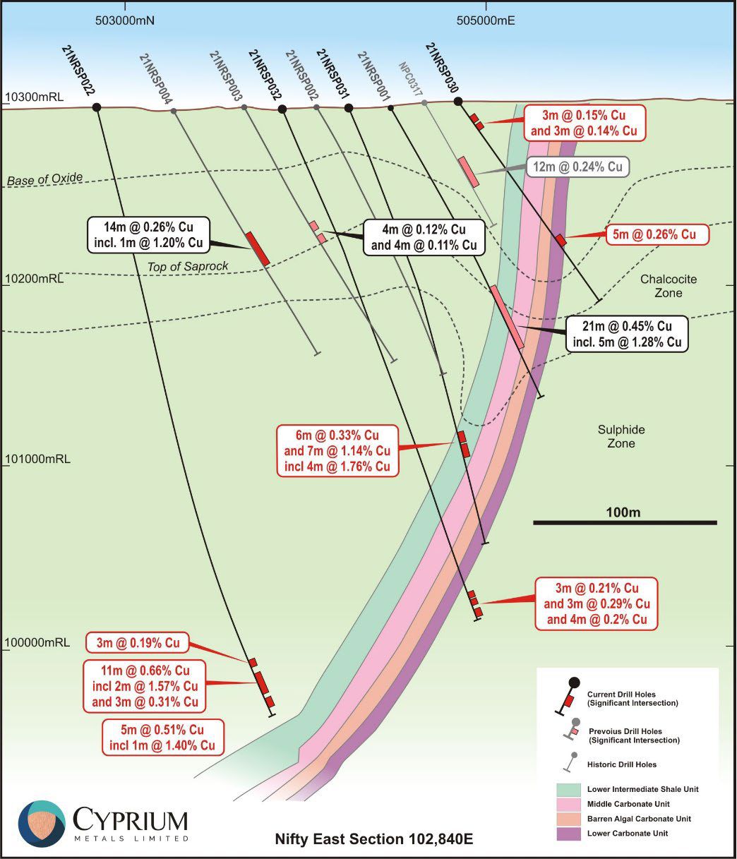 Hole 21NRSP026 has intercepted the southern sub-parallel zone of supergene copper mineralisation (6m at 0.16% Cu). Sulphide mineralisation within the Nifty Syncline carbonate-shale host rocks was intercepted at depth (7m at 0.30%, 7m at 0.34% Cu and 4m at 0.20% Cu).