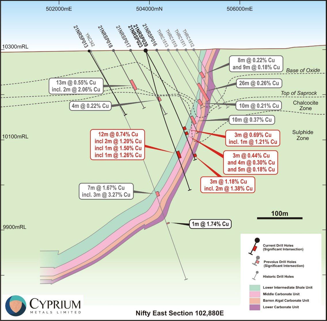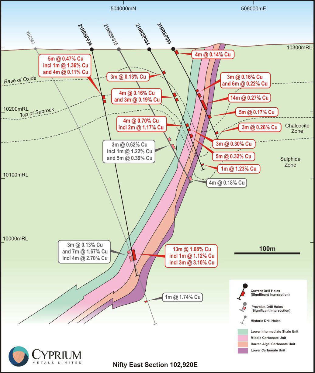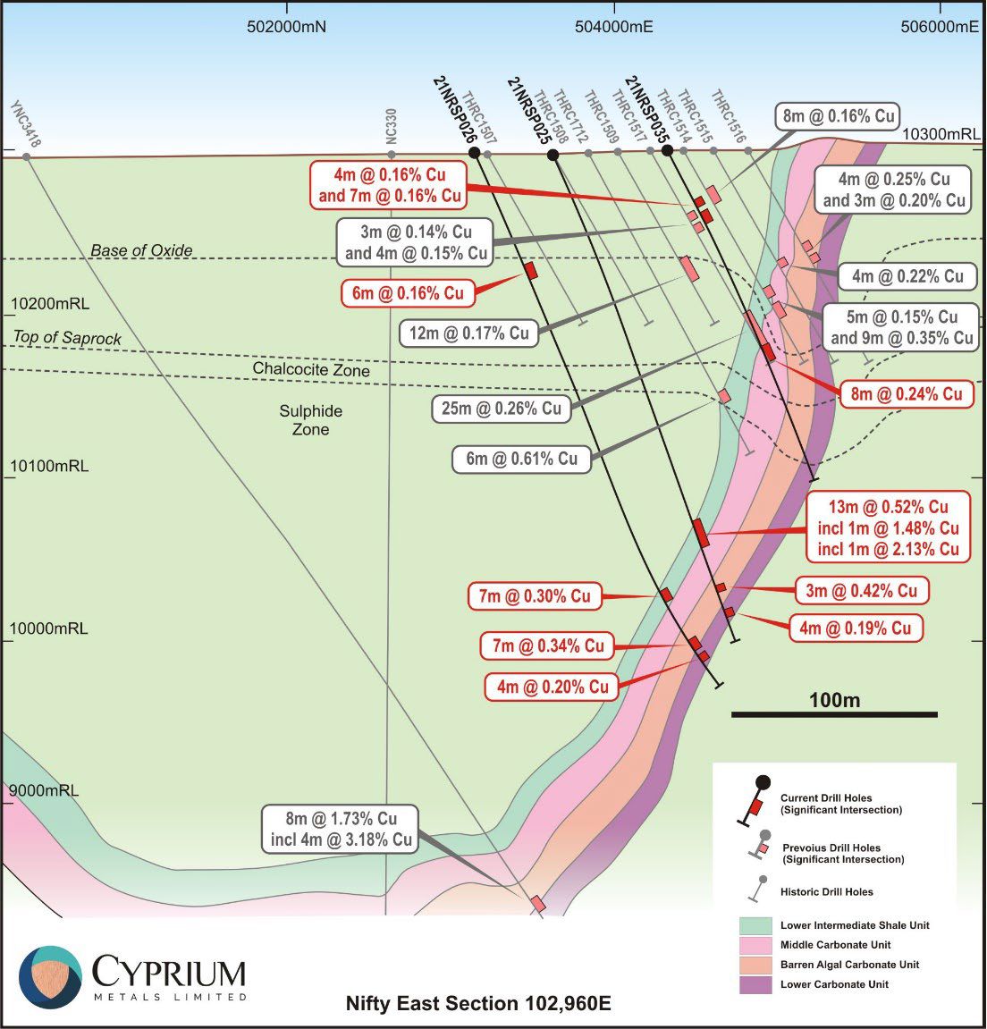 The drilling has identified further extensionsto the oxide mineralisation east of the Nifty pit. The mineralisation is mostly in proximity to the northern limb of the Nifty Syncline. It has also been confirmed to extend further south, interpreted as an extension of the sub-parallel zone of supergene copper mineralisation, which was identified in the first phase of drilling by Cyprium Metals in 2021.