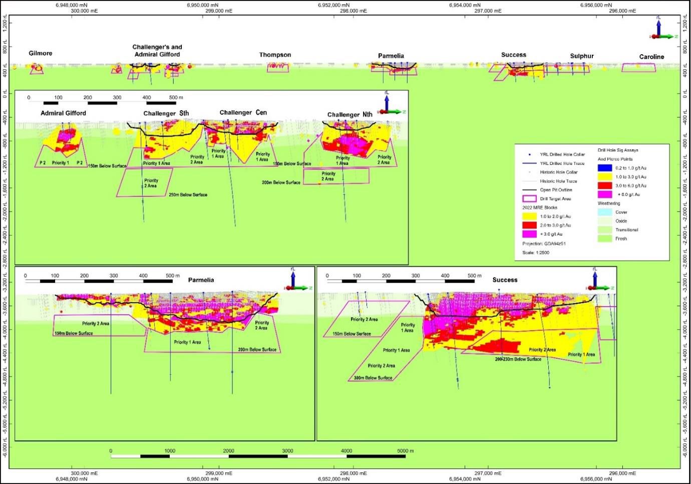 During the September 2022 quarter, the Company completed initial Mineral Resource Estimates ("MRE's") on the margins of the Success, Parmelia and Challenger historic open cuts which resulted in a combined Resource inventory of 2.225Mt @ 1.9g/t Au for 136,000oz at a 1.0g/t lower cut-off.