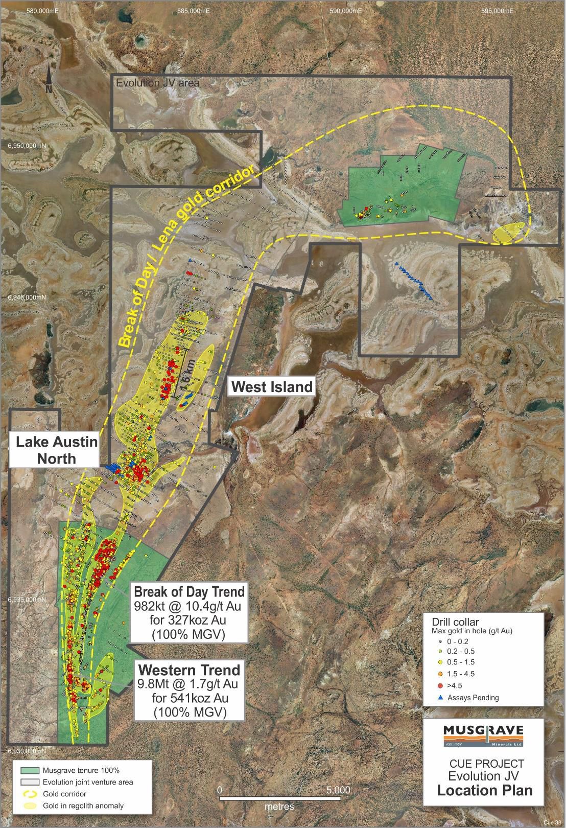 The Cue JV is primarily focused on Lake Austin which lies to the north of the Company's 100% owned Mineral Resources at Cue (Lena, Break of Day, White Heat-Mosaic and Big Sky deposits, and the Mainland option area - Figure 1*).