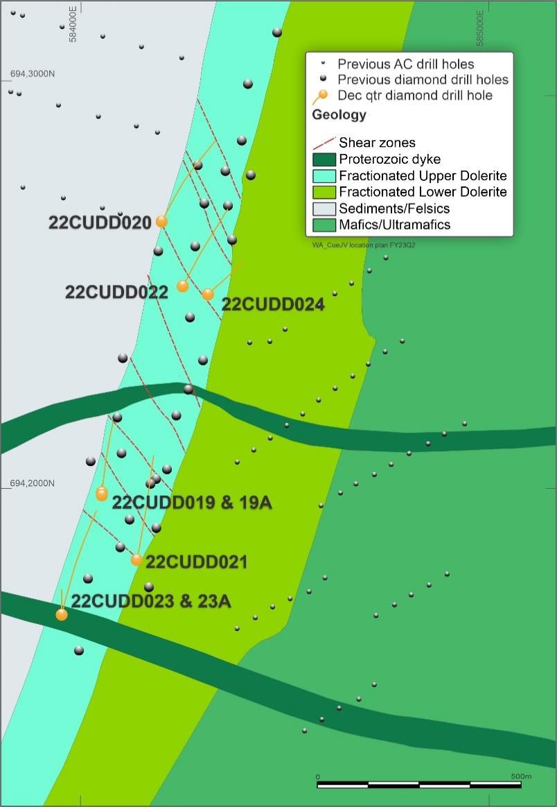 Evolution drilled a further 9 diamond holes for 4,091m on the Cue JV of which six with assays received are reported in this release. The drilling program is targeting the key mineralised gold lodes to determine the scale of the mineral system at West Island (Figure 2*). The mineralised lodes are interpreted as a series of stacked shears and veins, with associated high-grade splays.