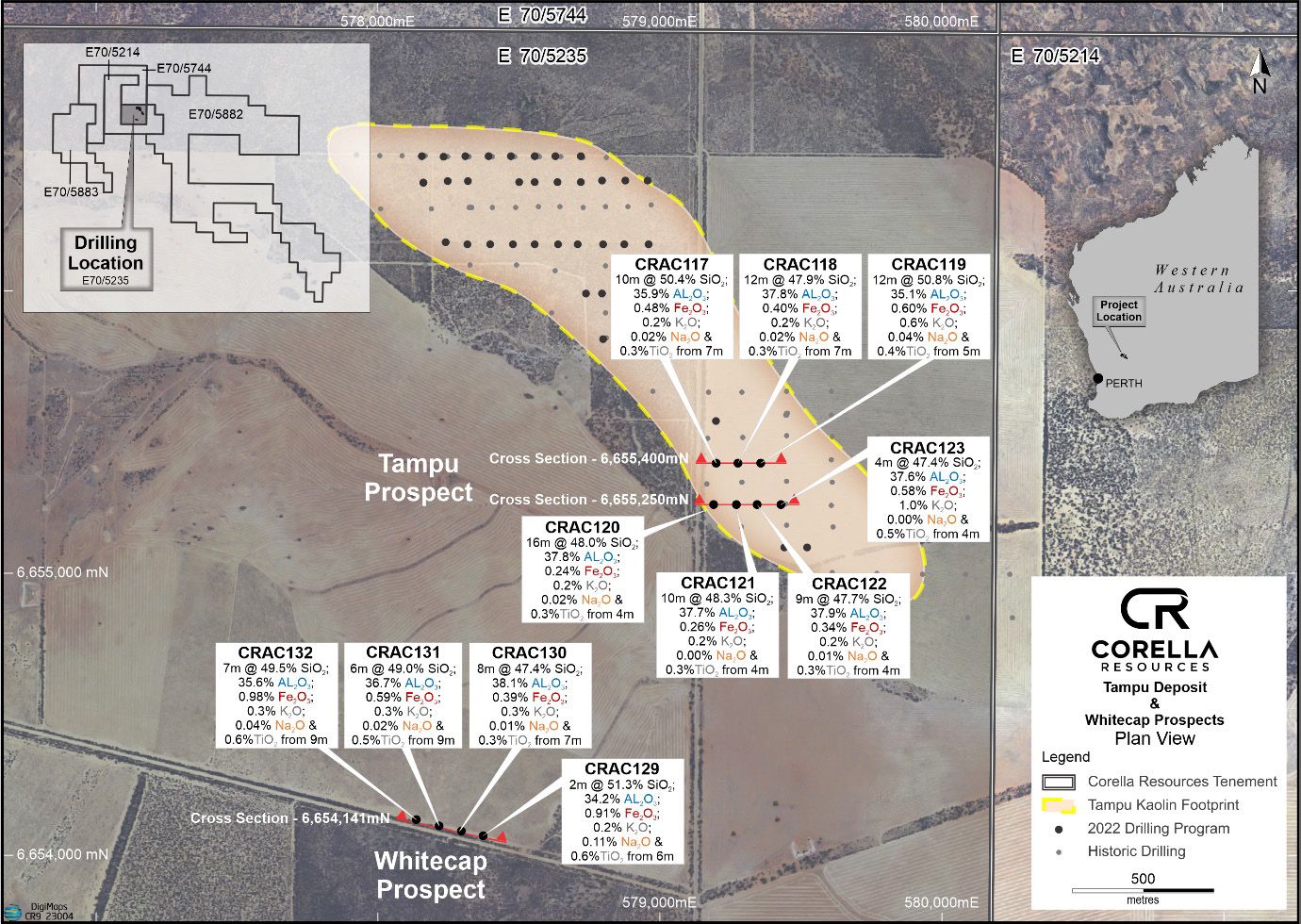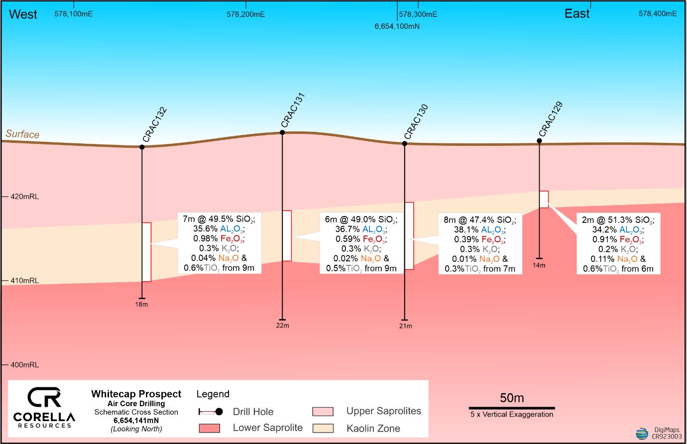 Corella Resources Managing Director, Tony Cormack, commented "These outstanding aircore drill intercepts from our discovery holes into our Whitecap and Whitehills prospects are exactly what we were aiming to achieve. The results demonstrate our strong understanding of the geology and mineralisation and our ability to add further high purity tonnes to our resource base from other prospects across the broader Tampu Project area."