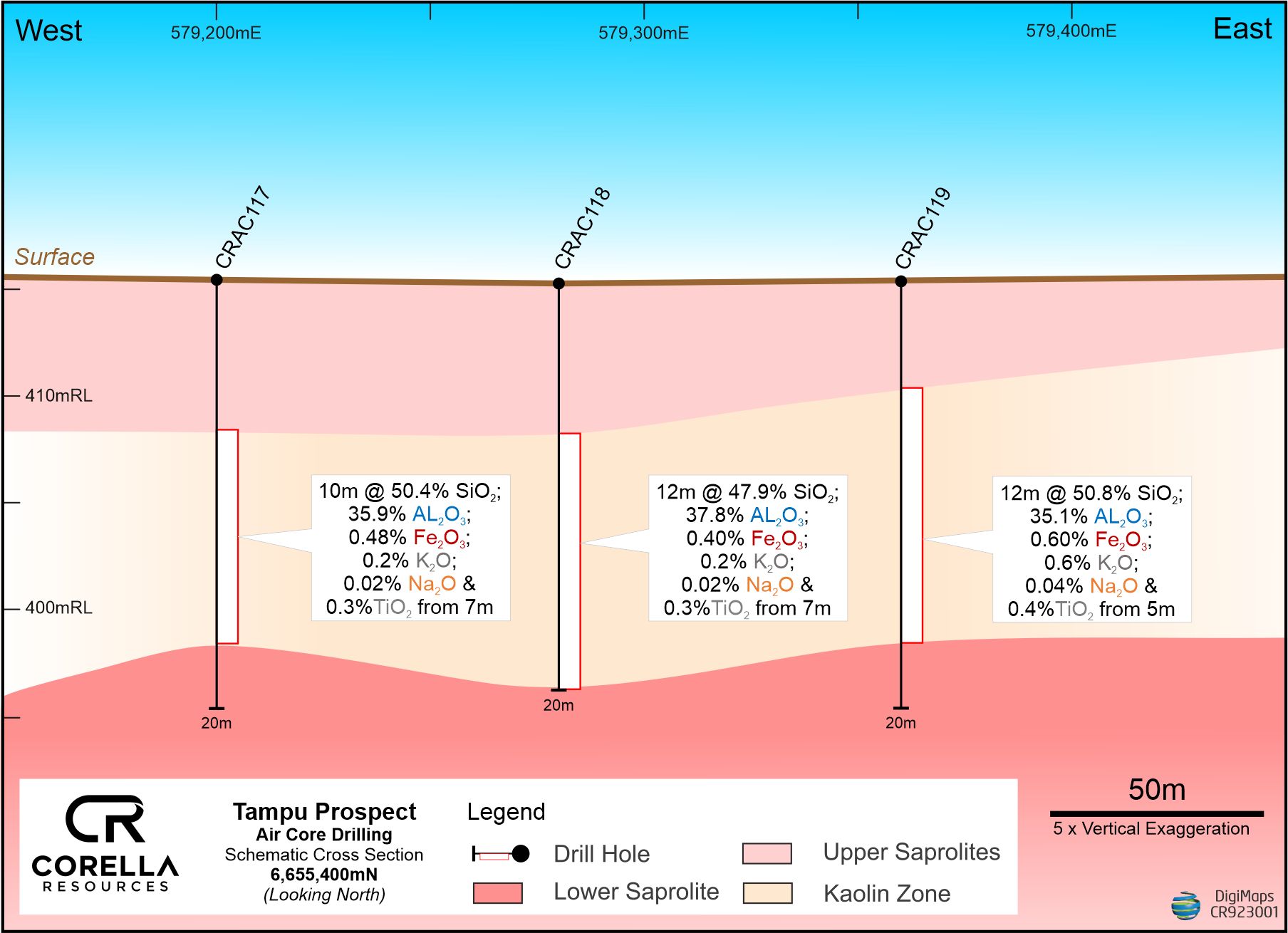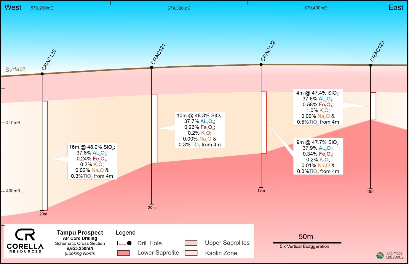 CRAC117: 10m @ 50.4% SiO2; 35.9% Al2O3; 0.48% Fe2O3; 0.23% K2O; 0.02% Na2O & 0.3% TiO2 from 7m