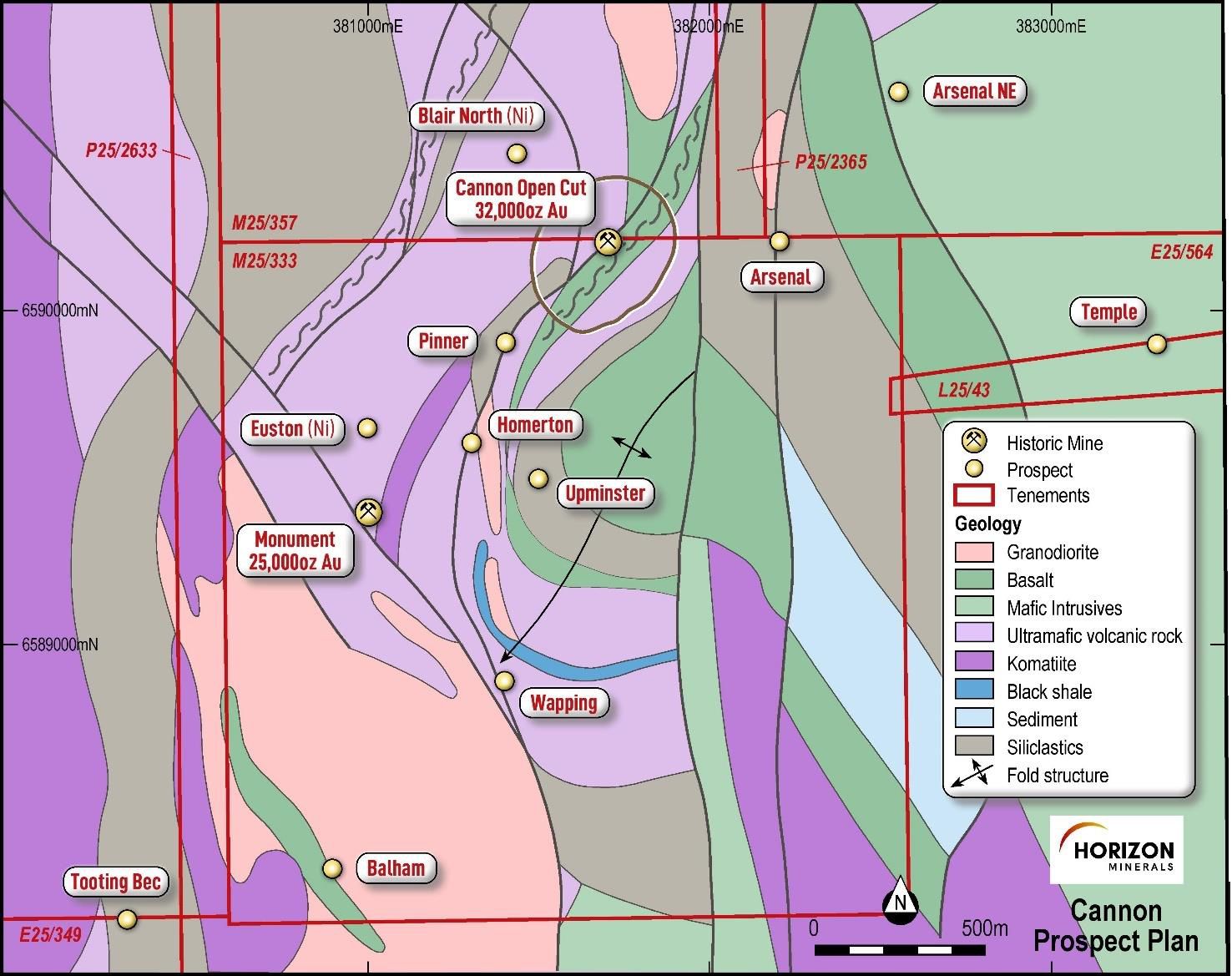 The Cannon deposit (Figure 1*) is located 30km east-southeast of Kalgoorlie in the Eastern Goldfields region of Western Australia on granted mining leases ML25/333 and ML25/357. The Cannon mine and surrounding area is dominated by mafic to ultramafic rocks of the Bulong Complex overlain by a sequence of felsic volcanics, volcaniclastics and sediments. Lithologies present include komatiitic mafics and ultramafics, peridotites, basalts and gabbros. Sedimentary rocks include shales and cherts with rare, banded iron formation. The geological structure is complex and dominated by the Cannon shear which is recognised as a key ingredient for local gold and possibly nickel sulphide mineralisation.