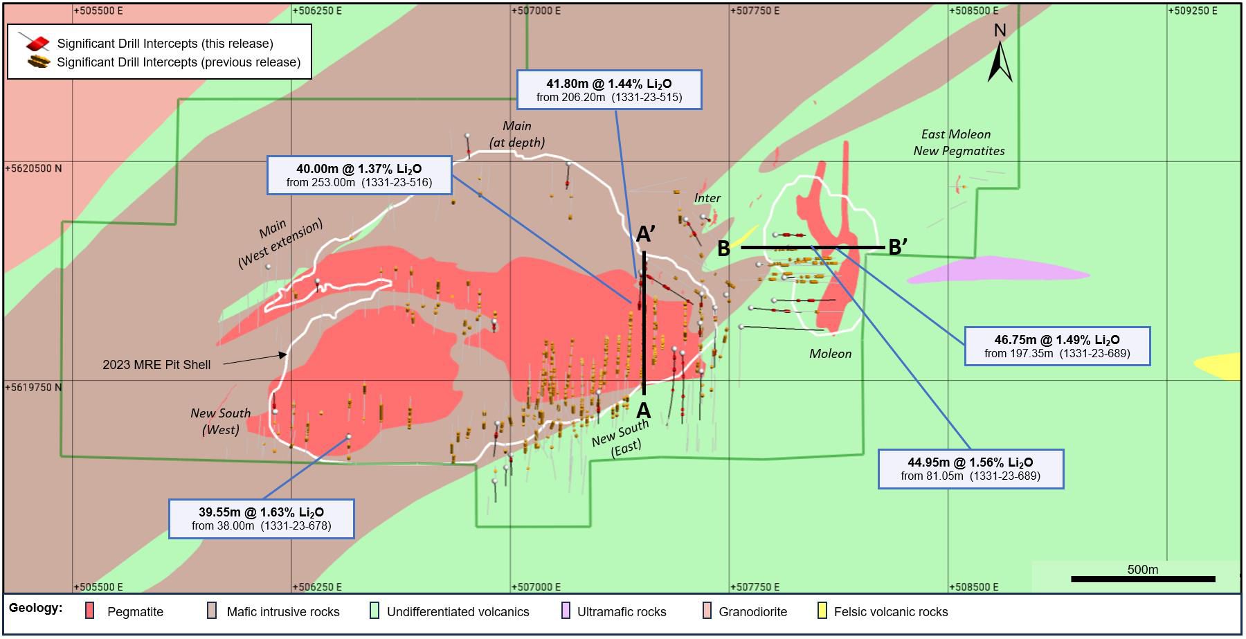 - New drilling results illustrate the potential connection between the Main, South, New South, Inter and Moleon sectors within a single extensive lithium mineralised system.