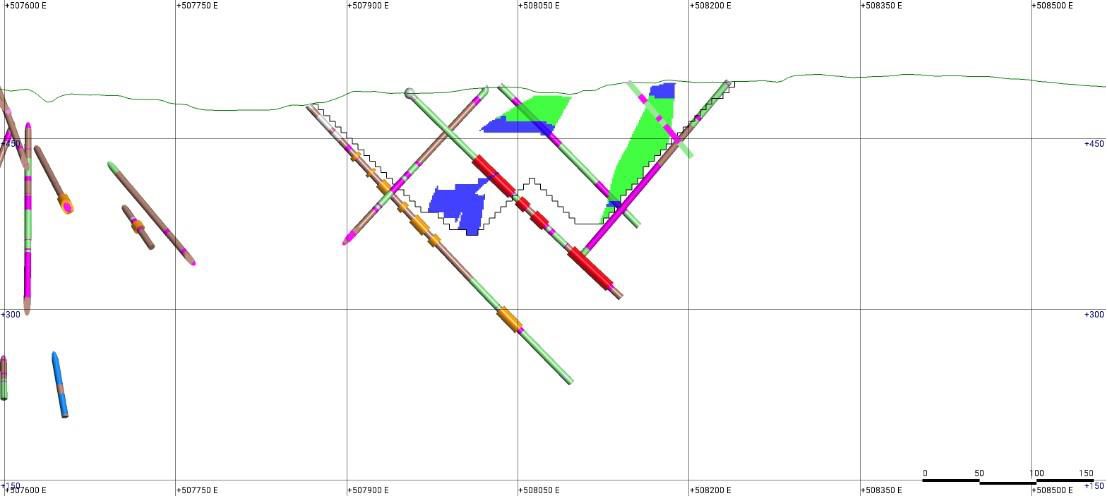 Previous and new results confirm the presence of wide flat dykes (up to 50m of estimated true width) and a couple of smaller parallel-trending dykes that may extend to the east, to the west and to the south. These additional diamond drillholes in the South and New South areas will potentially allow to upgrade the Inferred mineral resources to Indicated category in a future mineral resource estimate update.