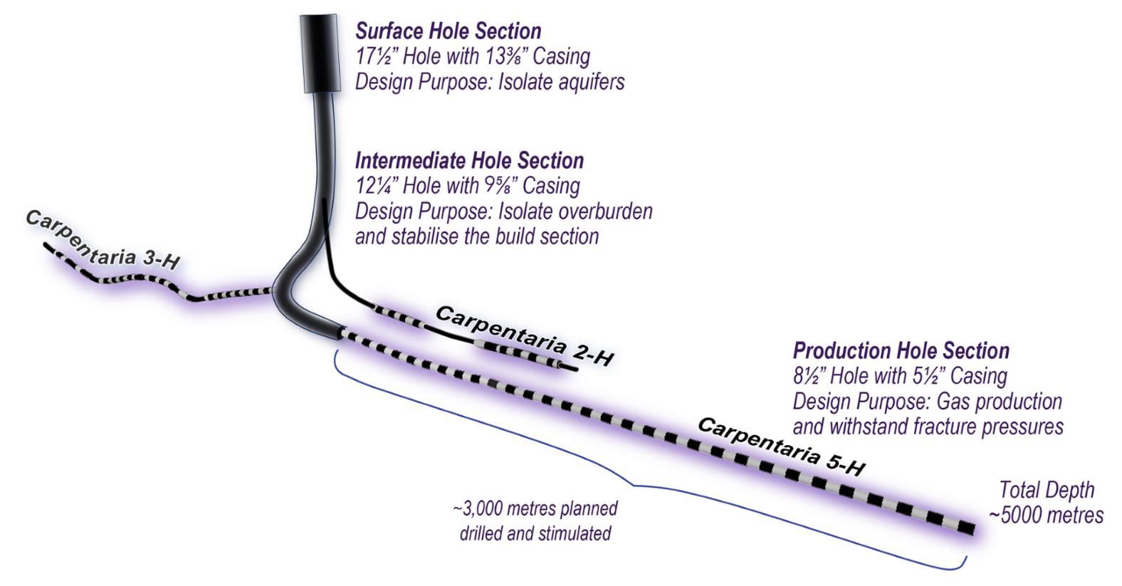 C-5H is being drilled from the same well pad as Carpentaria-2H and 3H. C-5H will be drilled with a longer lateral length and larger well diameter. This will allow a longer section of the shale to be stimulated and produced (3,000 metres) and for the stimulation to be delivered more effectively through the larger well diameter. These changes are intended to deliver higher gas production rates than previous wells.