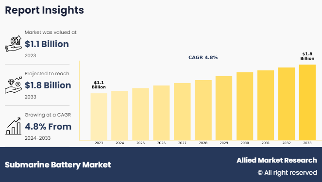 According to a new report published by Allied Market Research, the global submarine battery market size was valued at $1.1 billion in 2023 and is projected to reach $1.8 billion by 2033, growing at a CAGR of 4.8% from 2024 to 2033. Submarine batteries are a critical power source for underwater vessels, supplying energy to onboard systems and propulsion mechanisms when submerged. While diesel engines drive submarines on the surface, batteries become indispensable during underwater operations, ensuring safety, propulsion, and stealth.