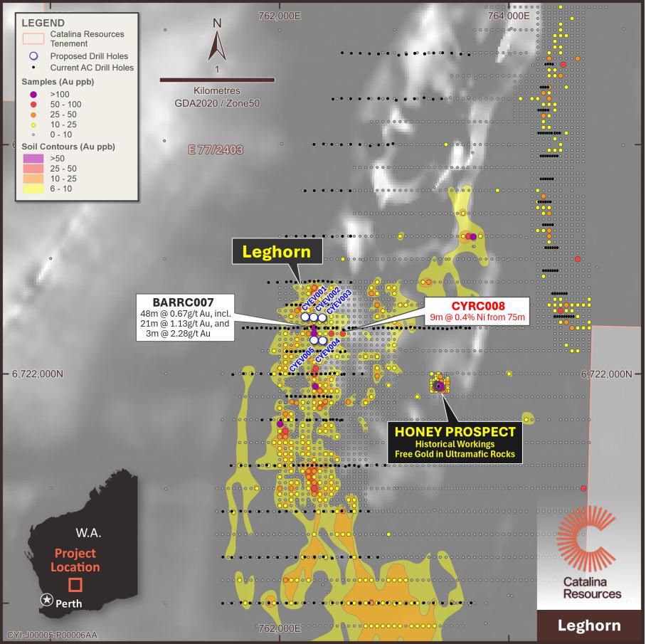 - Previous RC drilling at Leghorn returned multiple +1 g/t Au intercepts, with mineralisation remaining open to the north. Previous Results include: