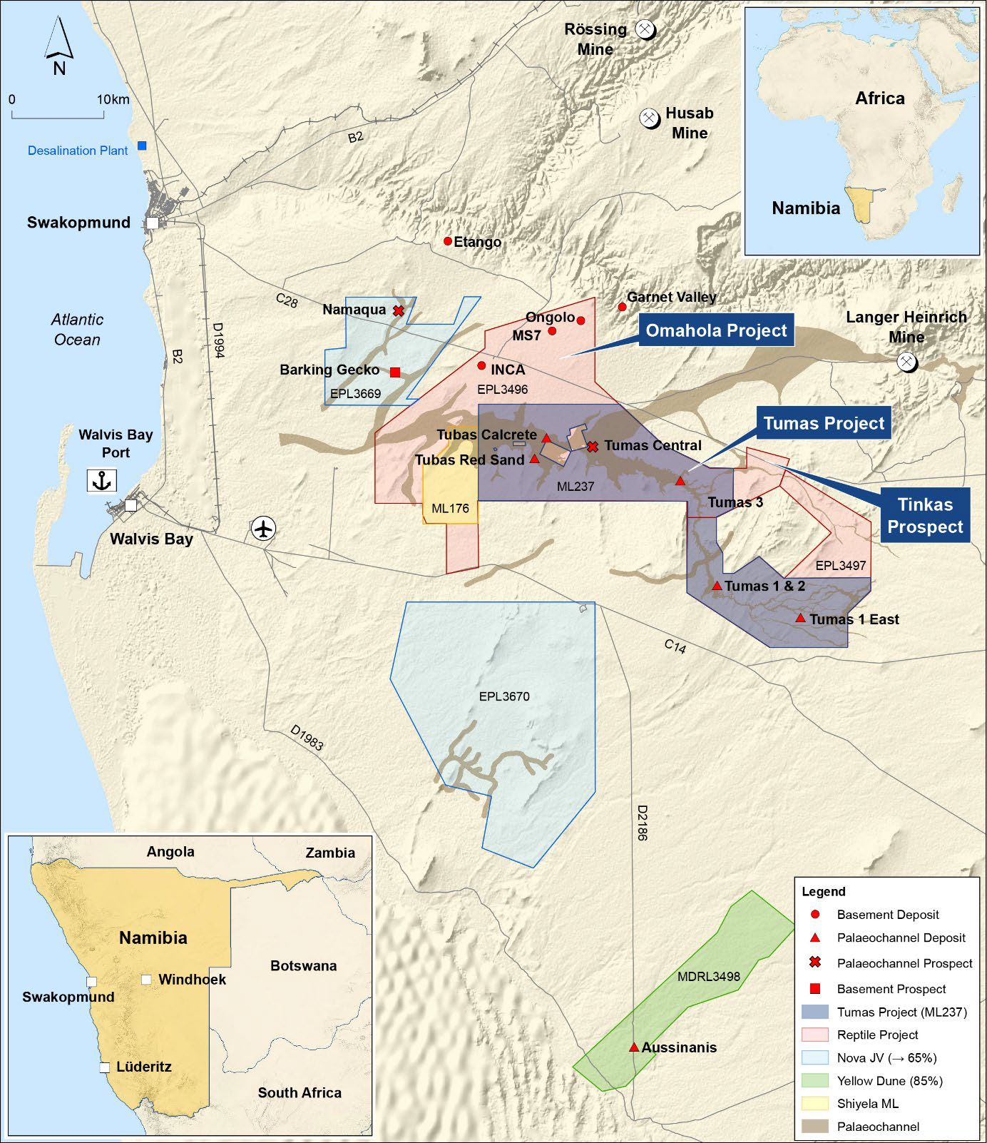 - Broad-spaced exploration drilling to evaluate the Tumas palaeochannel west of the Tumas ML237, totalling 39 holes for 1,801 m, was completed mid-November 2025.