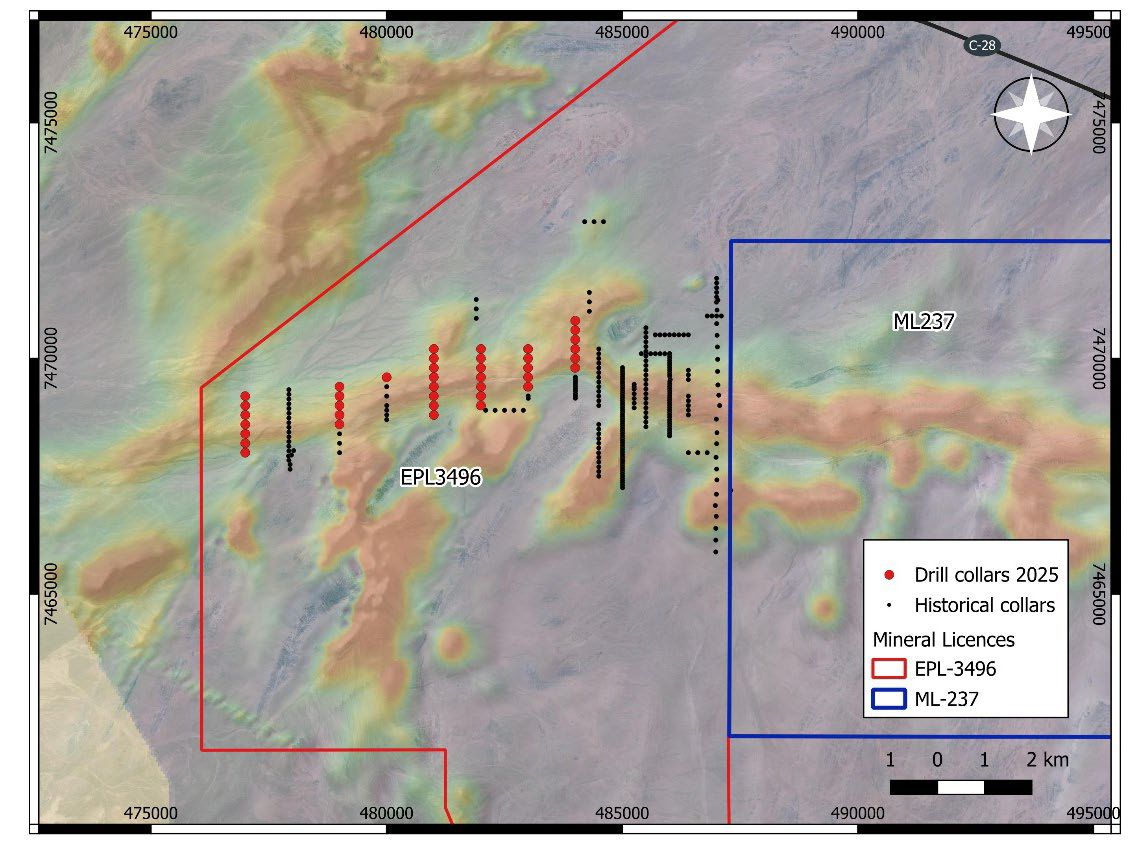 A reverse circulation (RC) exploration drilling program on EPL 3496 commenced on 15 October 2025 and targeted a previously untested 7 km section of the Tumas palaeochannel, located approximately 15 km downstream of the main Tumas 3 area, west of ML237. The program comprised 39 holes for a total of 1,801 m and was completed on 13 November 2025. Drill line spacing was approximately 1 km, with drill holes spaced at 200 m intervals along each line.
