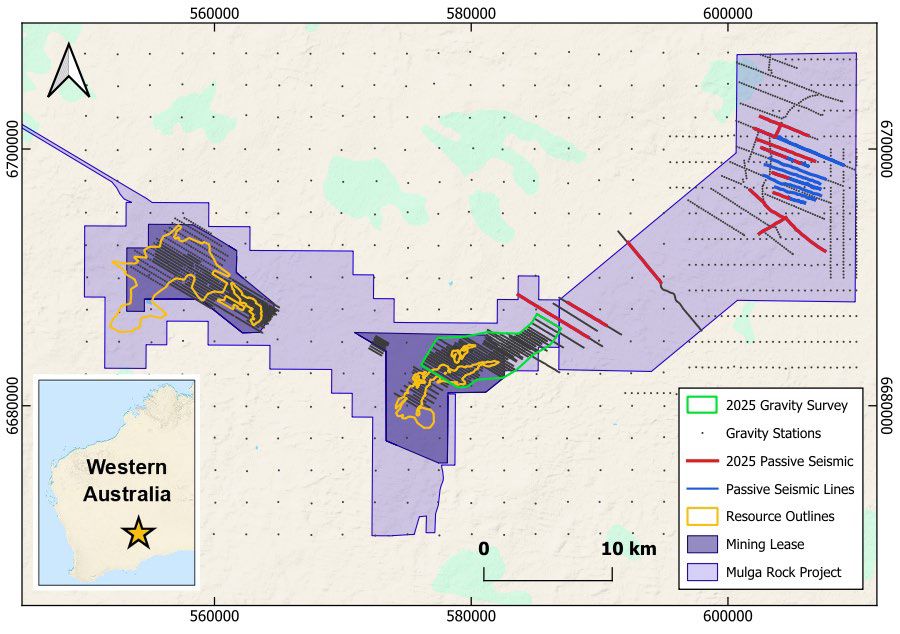 Ground gravity and passive seismic surveys were completed at Mulga Rock in October 2025 by Atlas Geophysics. The project involved the acquisition and processing of 2,025 new gravity stations at 50-100 m spacing and 213 new passive seismic stations at 200 m spacing. Final deliverables were received from Atlas Geophysics in early November 2025. Figure 8* shows the survey locations, and Figure 9* shows the preliminary results of the combined gravity surveys.