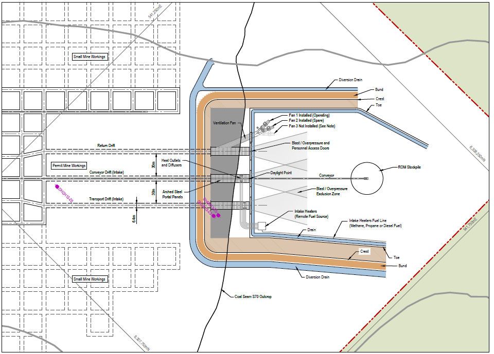 Close spaced diamond core drilling continues at Groundhog along section lines perpendicular to the strike of the main structure of the S70 seam as part of the portal development and main development headings. The Company continues to map the extent of the sub-crop and enhance understanding of the mine portal. A total of 28 diamond cored drill holes have been completed to date for this purpose within the portal area.