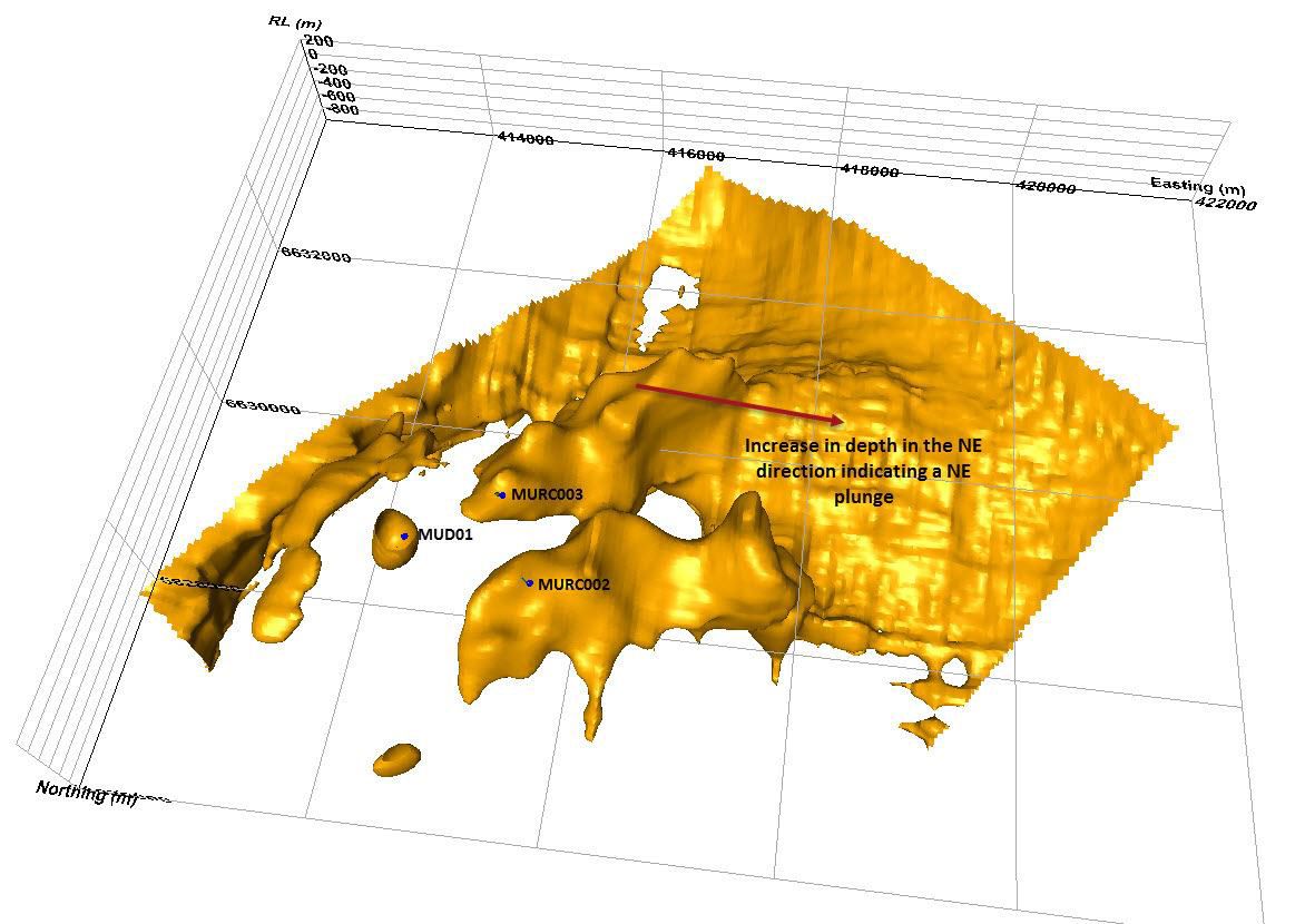 The modelling emphasised a deep low in the 800m area between the two YTC holes, ruling out any continuity of the copper-gold anomalism seen in them.