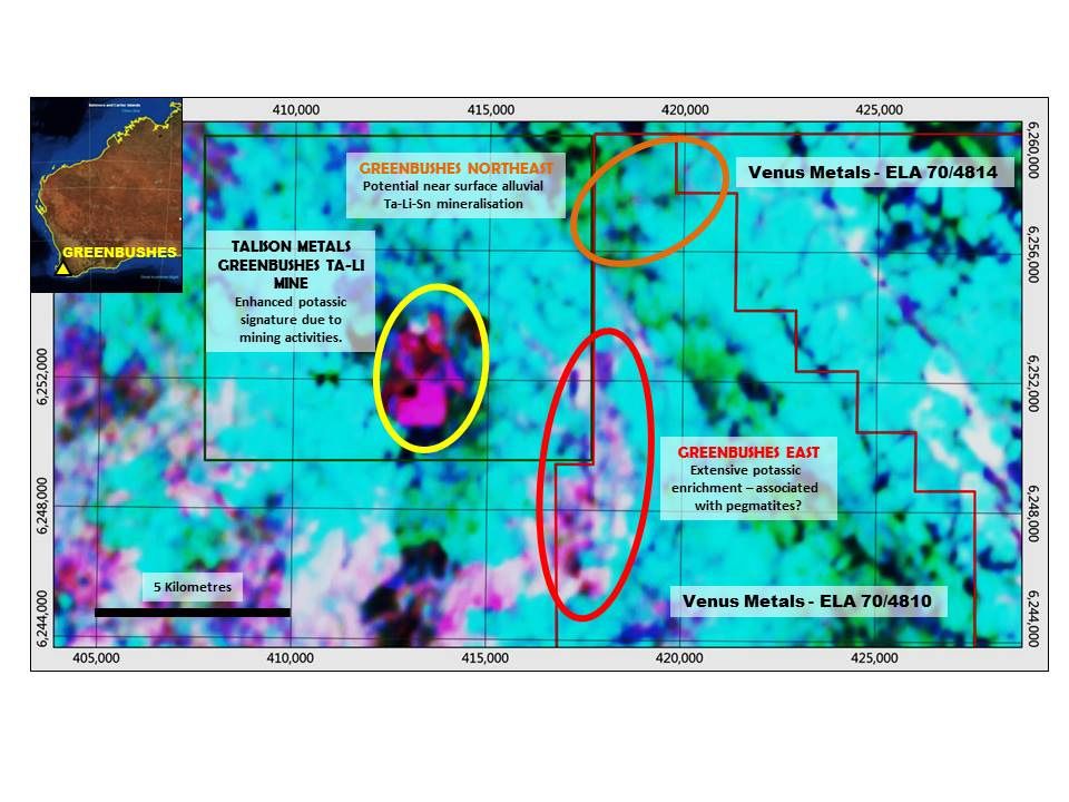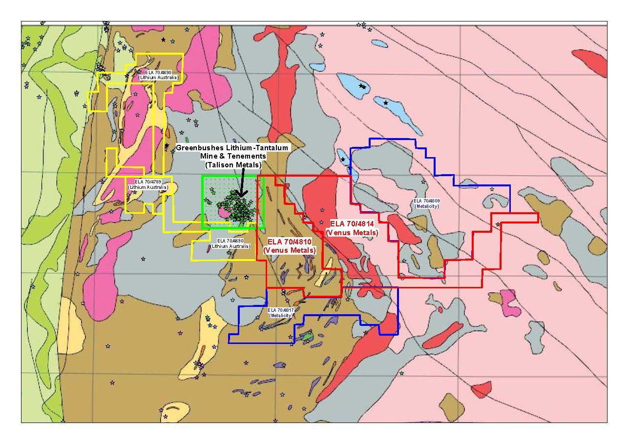 Venus Metals Corporation Limited ('Venus Metals') has made applications for two strategic exploration licences in the Greenbushes region of Western Australia. These new applications cover an area of adjacent to, and east of, the world-class Greenbushes Lithium-Tantalum mine. The tenement areas contain outcropping pegmatitic stratigraphy, the host rock for lithium-tantalum mineralisation in the region.
