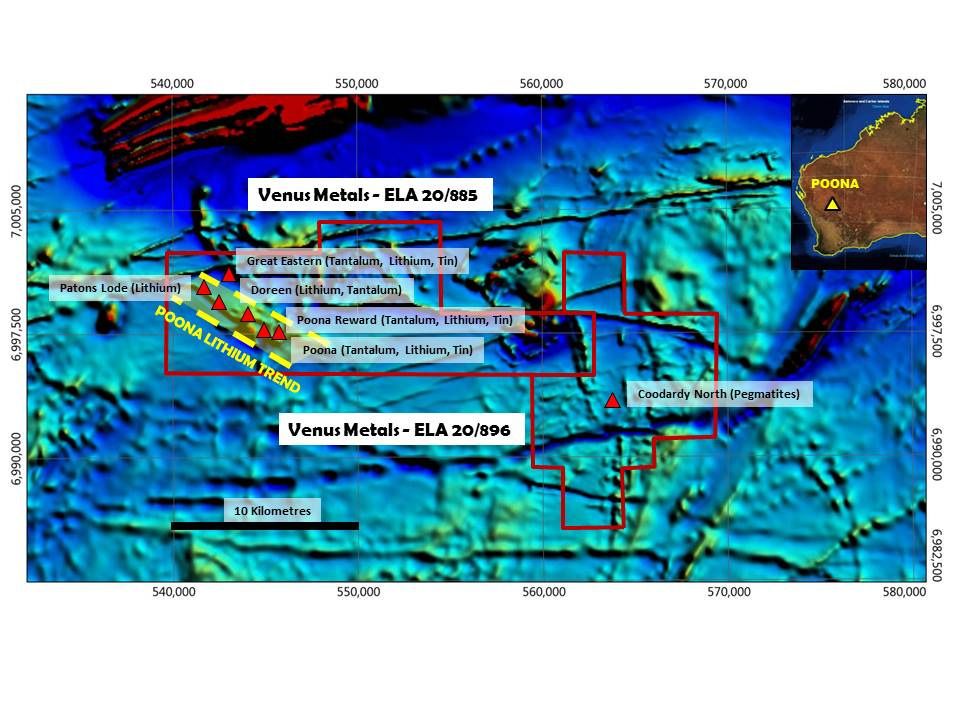 The Poona project is located in the Murchison Mineral Field, approximately 560 km to the northnortheast of Perth. The project area is composed of two exploration licenses (E 20/885 & ELA 20/896) covering more than 249 km2. These tenements overlie a number of recognised lithium and tantalum occurrences including Patons Lode & Poona Reward.