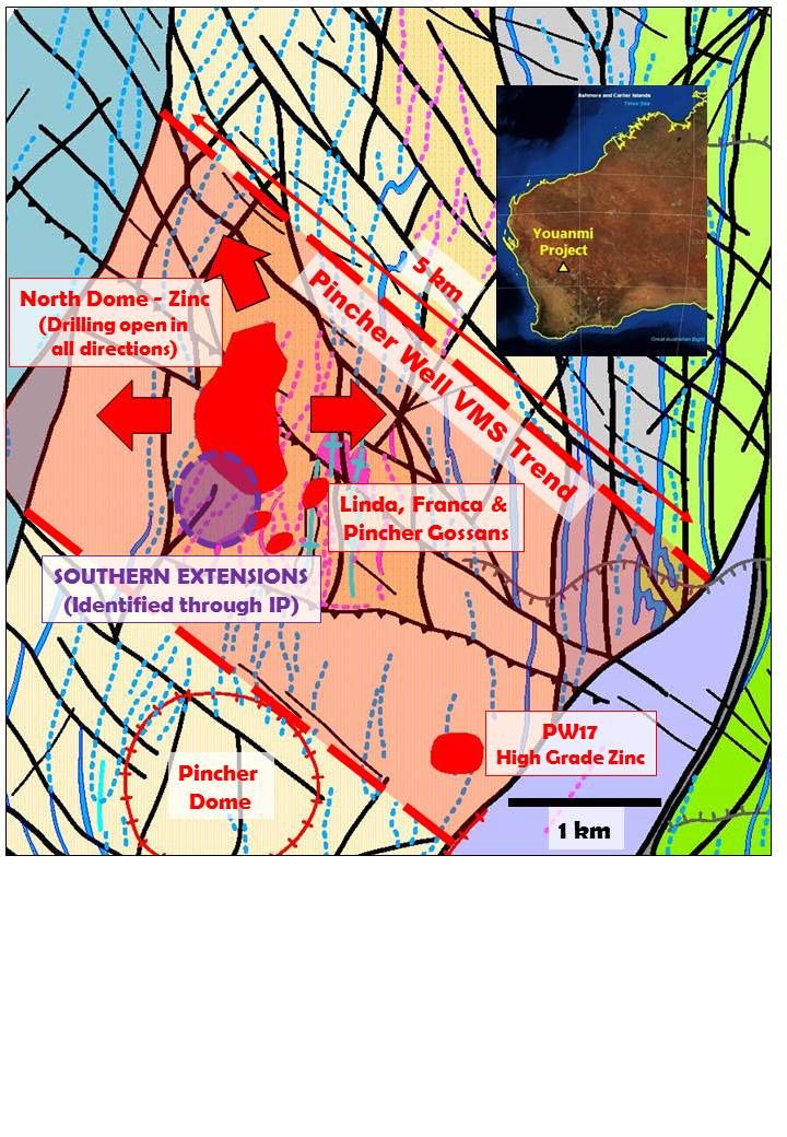 - A preliminary Induced Polarisation (IP) survey conducted at the Pincher Well Volcanogenic Massive Sulphide Trend ('VMS') has identified significant shallow 'up-dip' extensions, to the south of the known North Dome mineralisation.