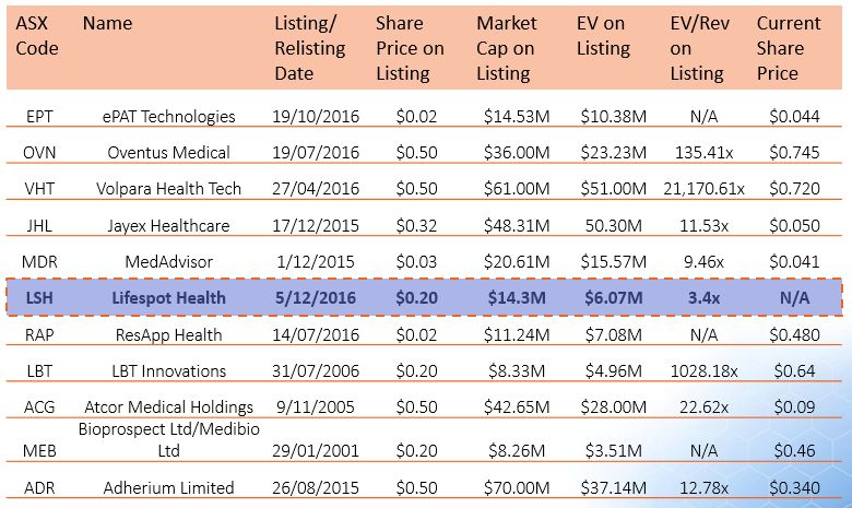 Lifespot Health is expected to list on the ASX at $0.20 share price in December 2016. The Company is raising AUD $5M - 8M with an enterprise value (EV) of AUD $6.85M ... at 5x, this is under $60M fully diluted. On listing, it will be trading at an Enterprise Value/Revenue multiple of only 3.4X, cheaper than all its peers. Please note: Lifespot Health is likely to be oversubscribed and you may not receive the full allocation bid for. Final bids are due 10am, Wednesday 7 December.