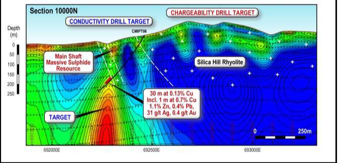 On Line 10,000 mN the IP conductivity data has clearly identified the small massive sulphide body at Main Shaft above the main rhyolite unit (see Figure 2 in the link below). A larger and stronger anomaly has been identified at about 200 metres below surface and just below the deepest hole drilled at Main Shaft (CMIPT06, Fig 2).
