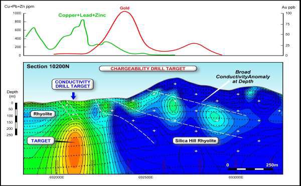 On Line 10,100 mN a significant coincident lead+zinc+copper-in-soil anomaly of about 1,000 ppm combined, occurs over the northern extension of the rhyolite unit associated with the massive sulphide mineralisation. There is a strong conductivity contrast below this anomaly.
