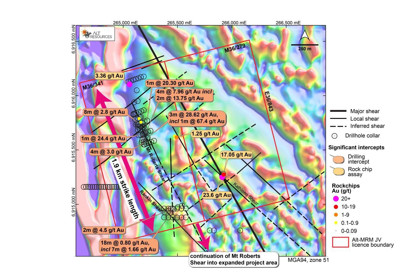 Alt CEO James Anderson commented "We have been looking to expand our footprint at the Mt Roberts gold project for some time now and Montezuma have provided us with this opportunity at very reasonable terms for the Company. Known gold-in-soil anomalism at the "Rum Punch" prospect extends well south into E 36/843. Previous explorers in the area such as Xstrata, Avoca and Jubilee were nickel-focussed and ignored the regional gold potential. We look forward to extending our drilling programs at Mt Roberts and testing some regional targets. Mt Roberts is now a district-scale project covering nearly 80km2".
