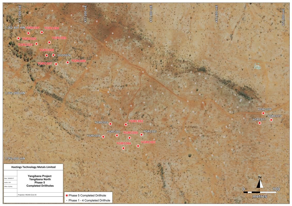 Holes YGRC85-91 tested the western portion of the Yangibana North Resources where the mineralisation is relatively shallow and flat-lying. The high grades returned in three of the recent holes, including Nd2O3+Pr6O11 grades exceeding 1.0% in two holes, are very encouraging and will enhance the next JORC resource estimation and subsequent pit optimisation.