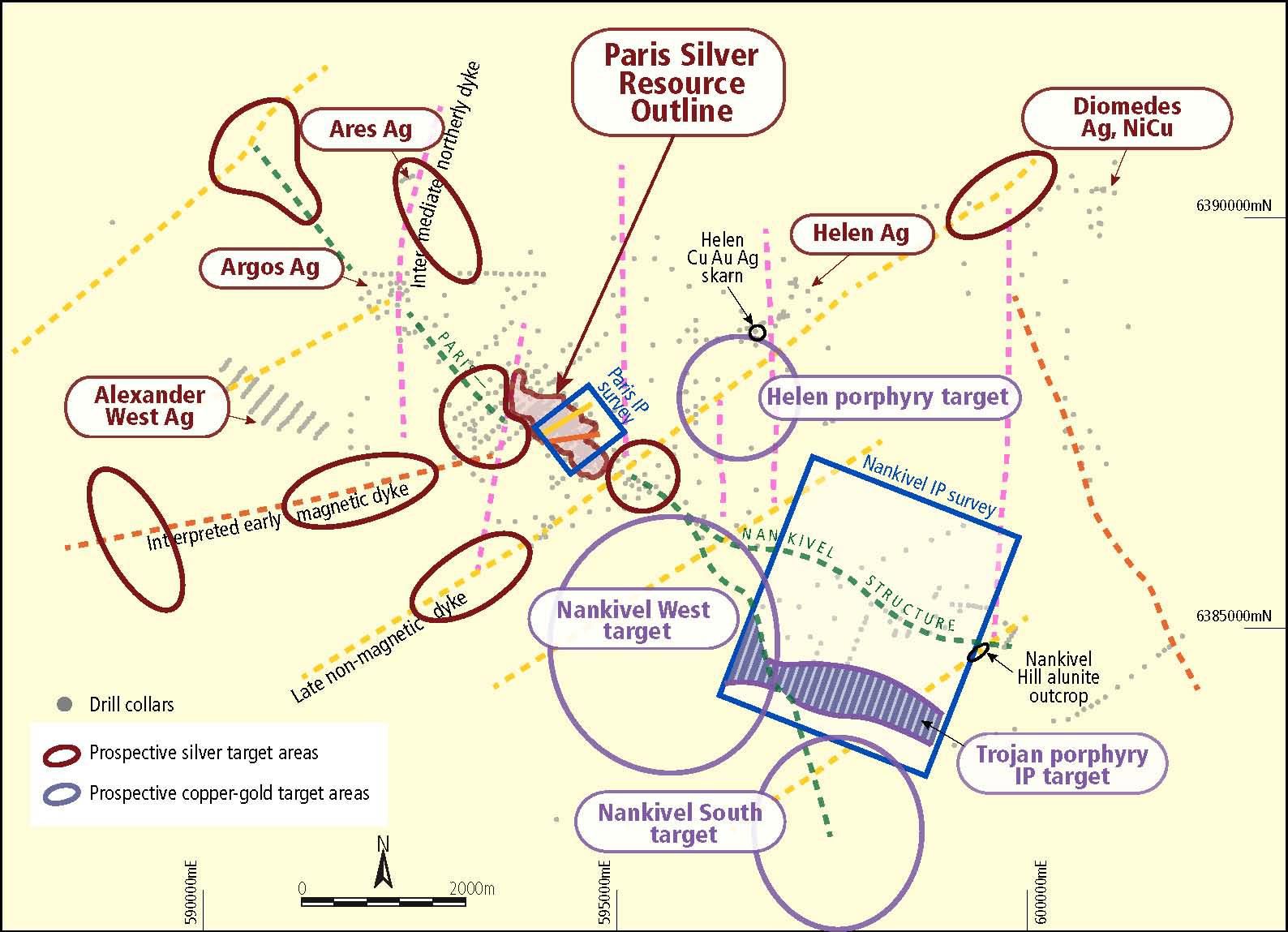 The polymict volcanic breccia is a positive association with the setting at Paris supported by the silver anomalism in the Trojan and Nankivel South areas. As for the Trojan area, the Nankivel South area also has positive indications of multiple subvolcanic dykes as expected for a prospective porphyry system.