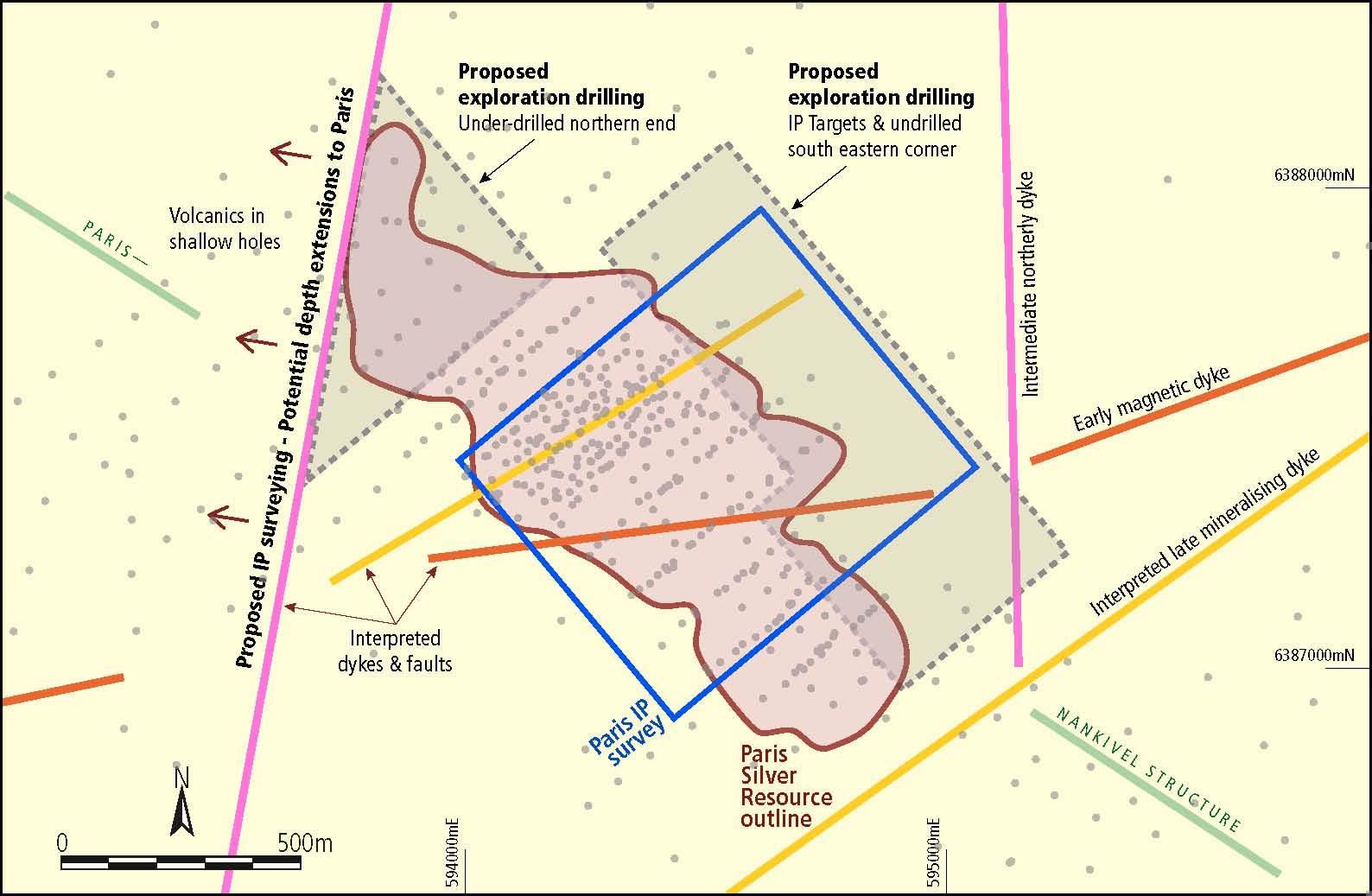 The extensions to the Paris deposit were accordingly reviewed. This identified under-drilled northern extensions near a northerly dyke and undrilled IP anomalies on the eastern side near north-easterly dykes (see Figure 3 in the link below).